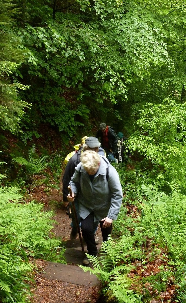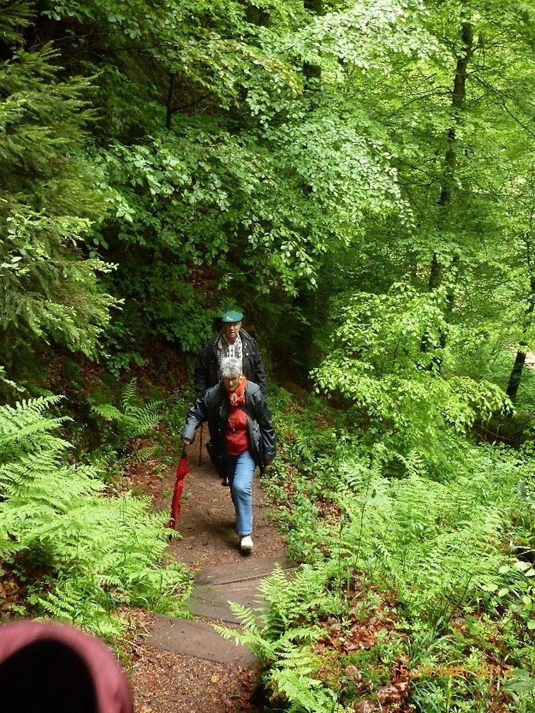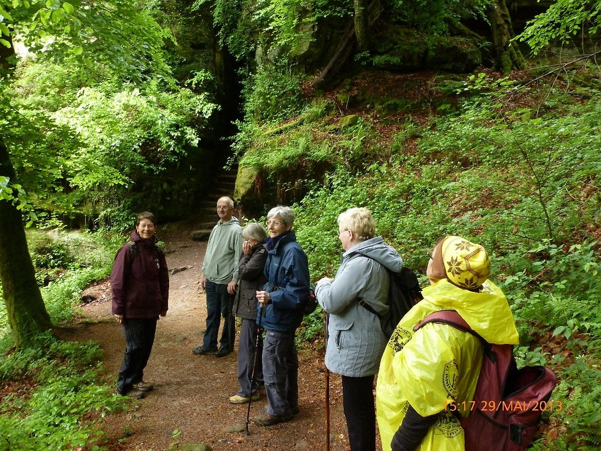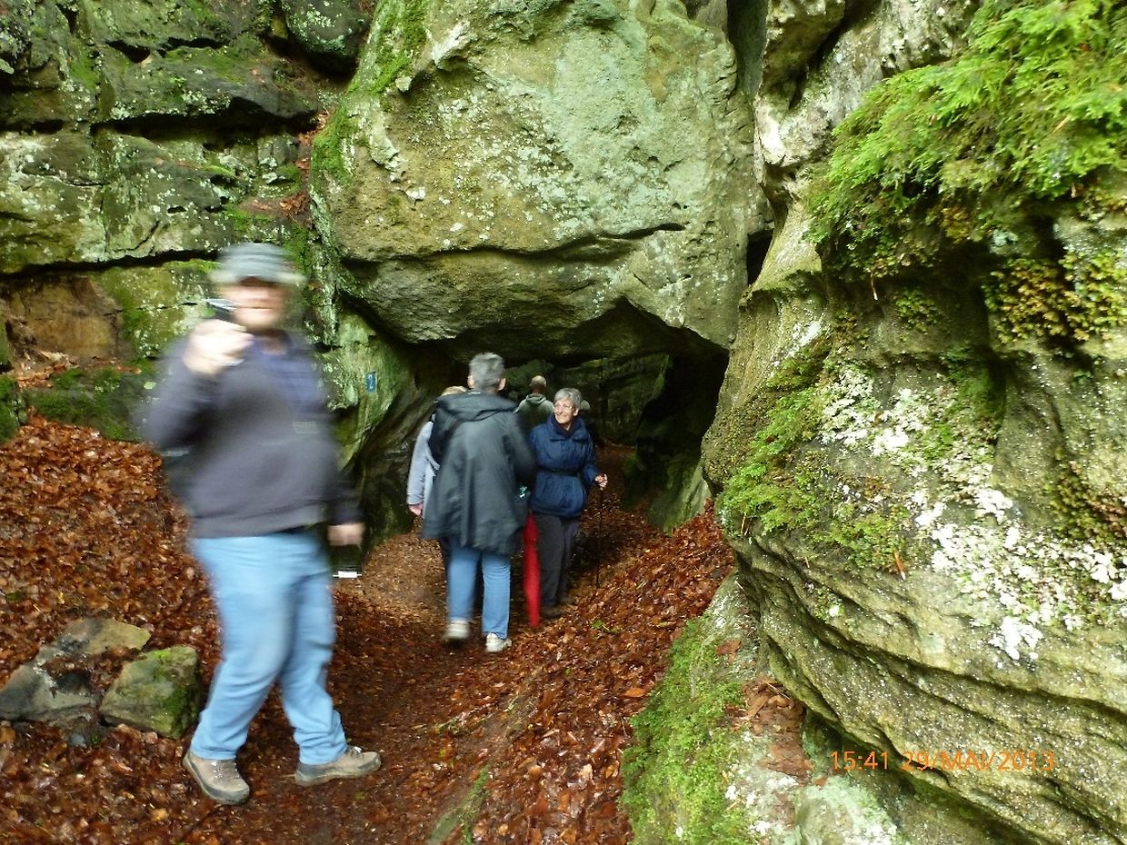 Petrus hatte es gut gemeint, der ganze Vormittag war verregnet gewesen, jedoch beim Eintreffen der Gruppe in Consdorf klärte sich der Himmel auf, die Regenjacken wurden wieder eingepackt und los ging es. Durch den oberen Ortsteils der Ortschaft Consdorf absteigend, gelangte die Wandergruppe in eine der bekanntesten Felsenlandschaften der Umgebung von Consdorf und der Kleinen Luxemburger Schweiz. Man musste sich durch die Felsspalten des « Rittergang » und dem « Déiwepёtz » zwängen und gelangte zu der weltweit bekannten stockfinsteren Felsenschlucht « Kuelscheier ». Dem « Kuelscheier Event » Pfad folgend, konnten die Seniorenwanderer das ganze Felsmassiv mit seinen Schluchten, Gängen, Spalten und Felsblöcken erkunden und verließen die stockfinstere Felsenschlucht tief beeindruckt von den Naturschönheiten welchen sie auf ihrem Wanderpfad begegnet waren.