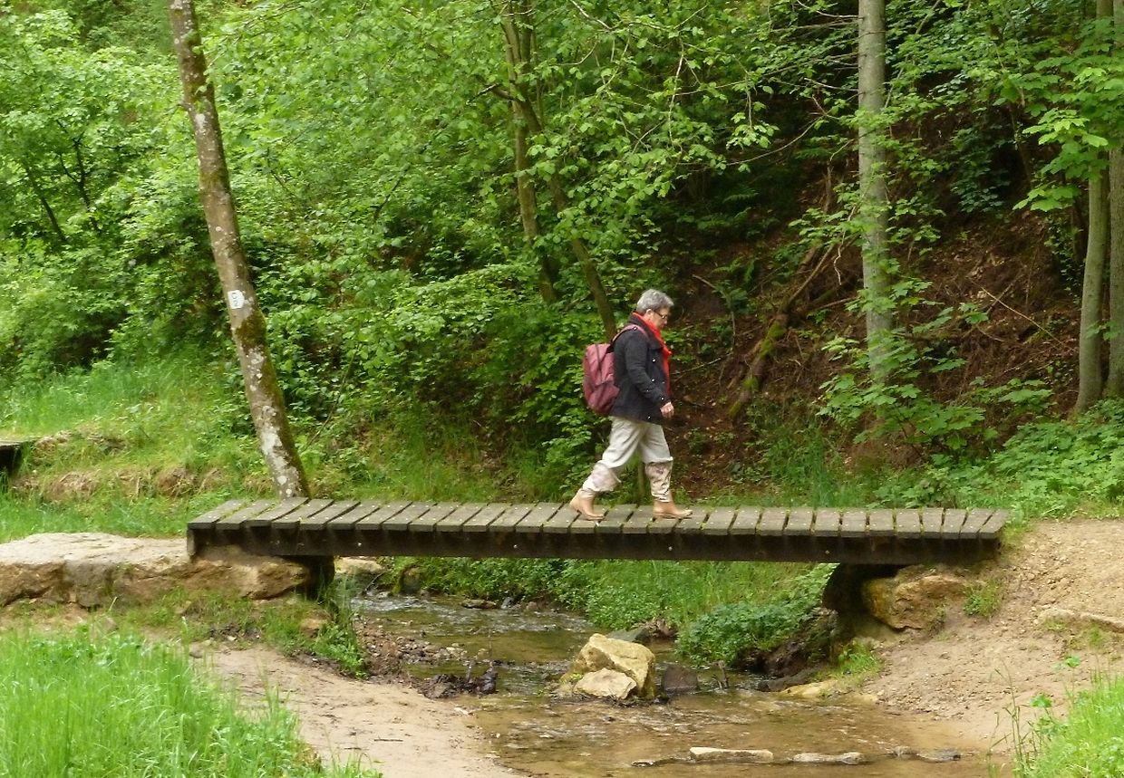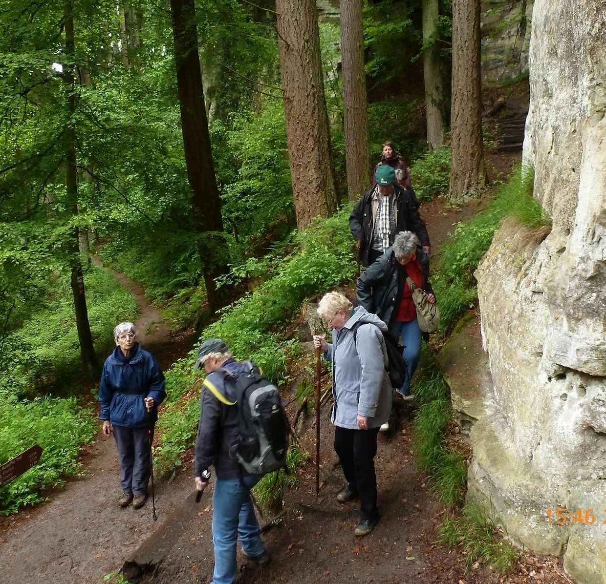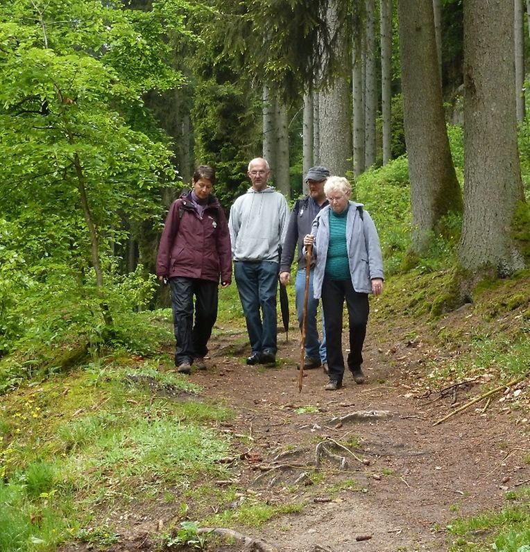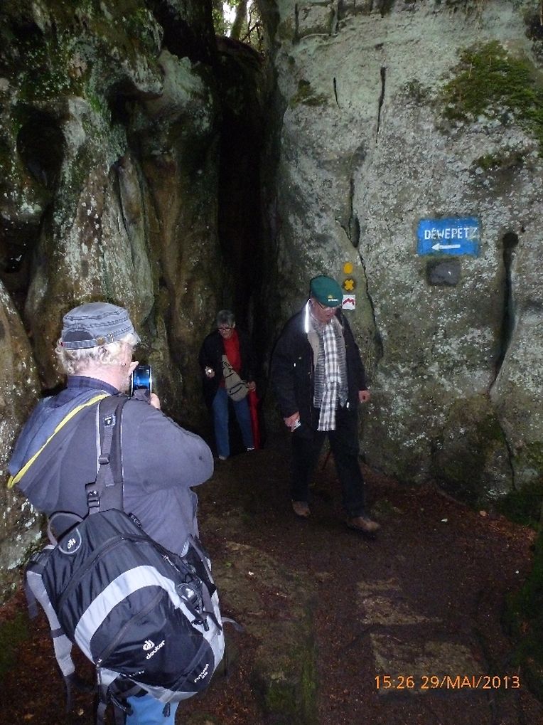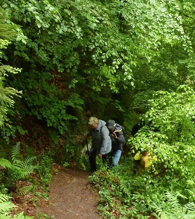 Petrus hatte es gut gemeint, der ganze Vormittag war verregnet gewesen, jedoch beim Eintreffen der Gruppe in Consdorf klärte sich der Himmel auf, die Regenjacken wurden wieder eingepackt und los ging es. Durch den oberen Ortsteils der Ortschaft Consdorf absteigend, gelangte die Wandergruppe in eine der bekanntesten Felsenlandschaften der Umgebung von Consdorf und der Kleinen Luxemburger Schweiz. Man musste sich durch die Felsspalten des « Rittergang » und dem « Déiwepёtz » zwängen und gelangte zu der weltweit bekannten stockfinsteren Felsenschlucht « Kuelscheier ». Dem « Kuelscheier Event » Pfad folgend, konnten die Seniorenwanderer das ganze Felsmassiv mit seinen Schluchten, Gängen, Spalten und Felsblöcken erkunden und verließen die stockfinstere Felsenschlucht tief beeindruckt von den Naturschönheiten welchen sie auf ihrem Wanderpfad begegnet waren.