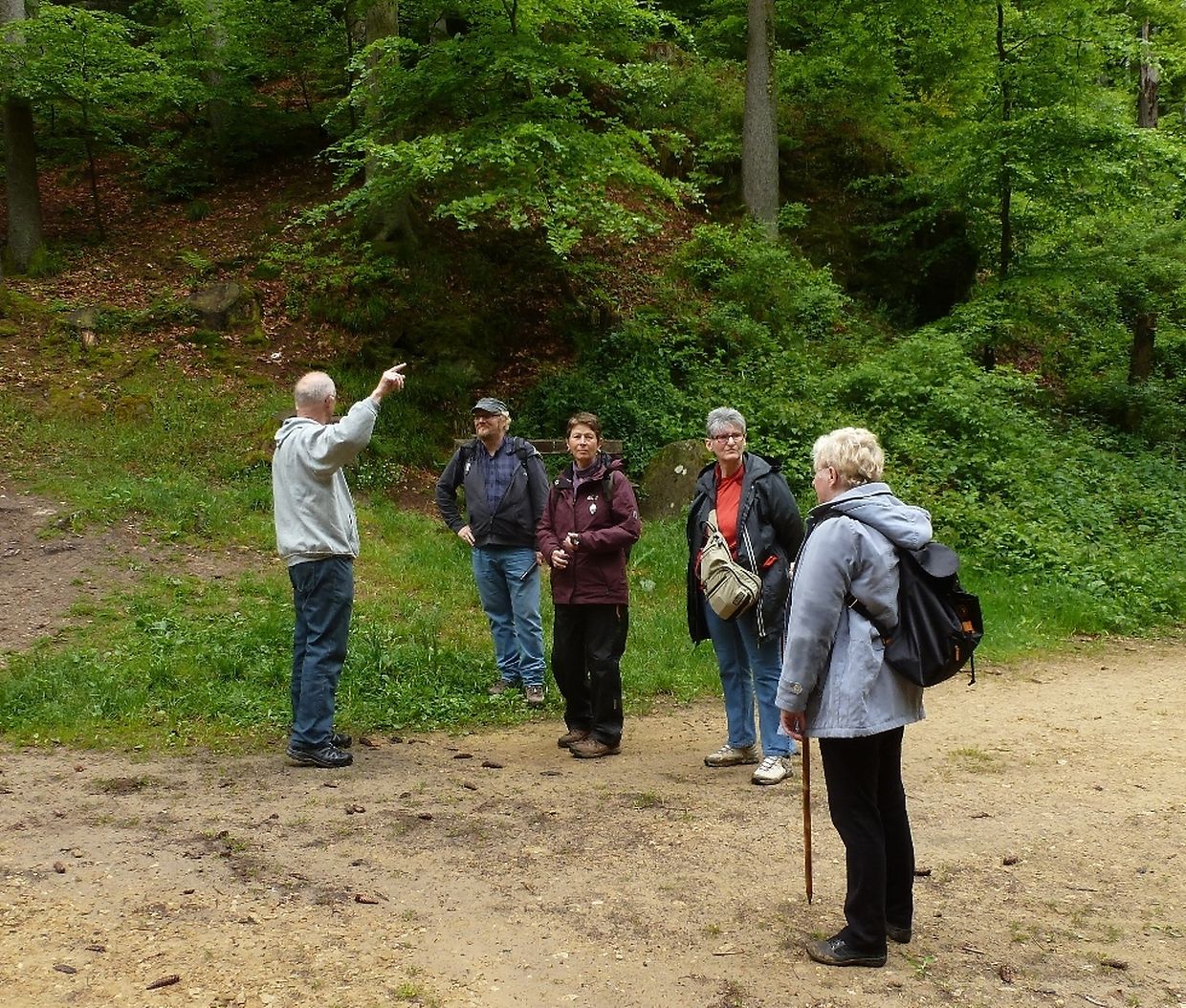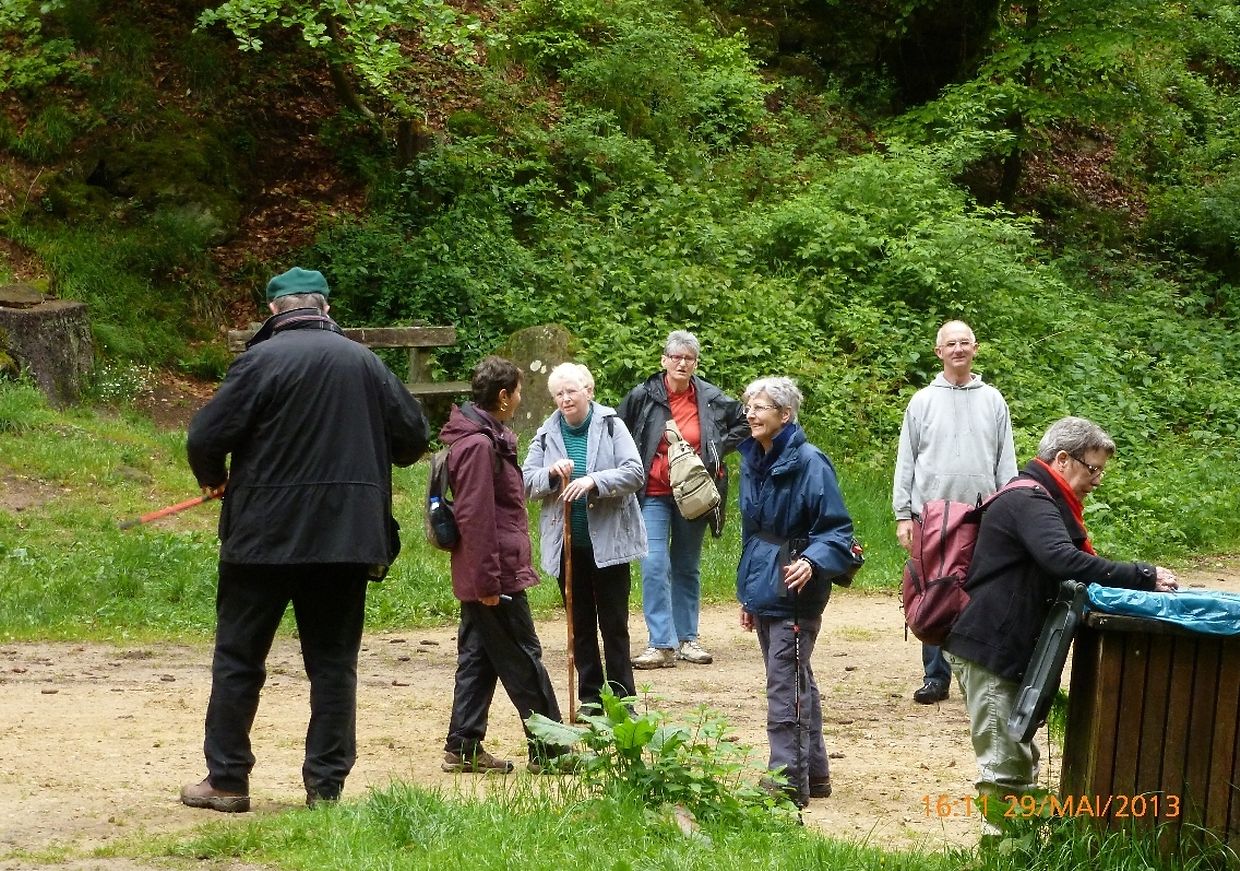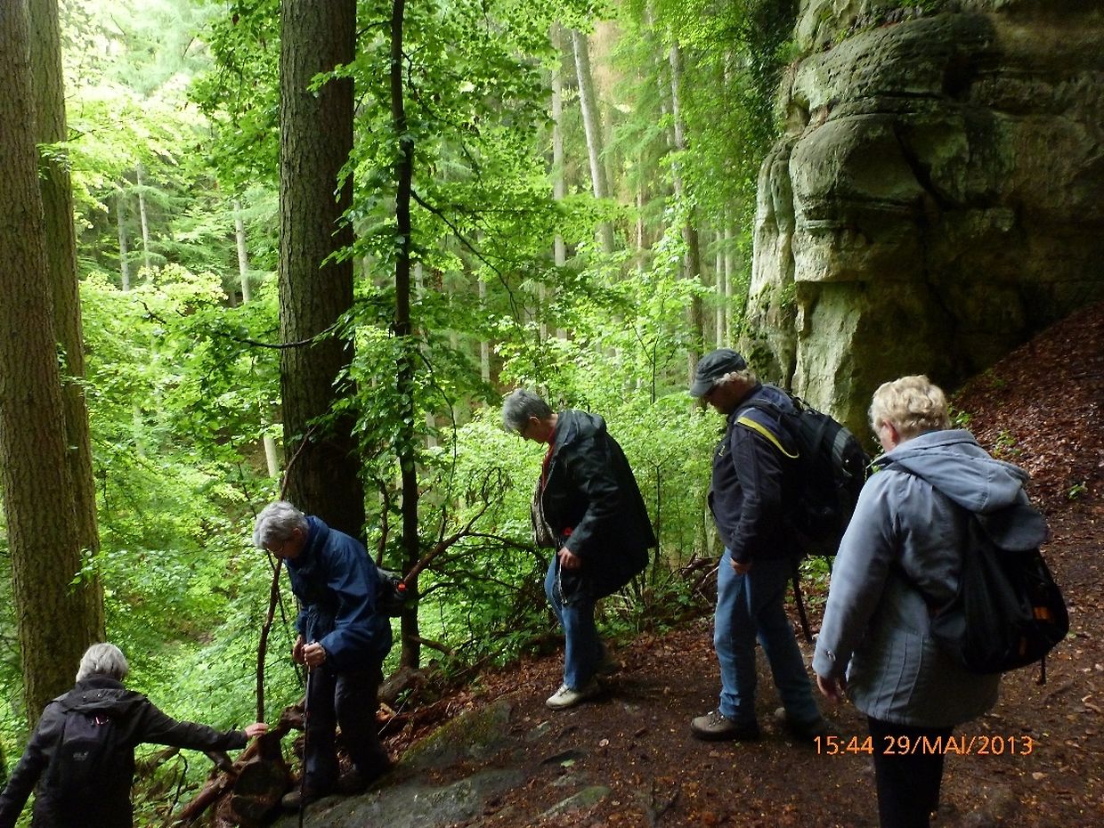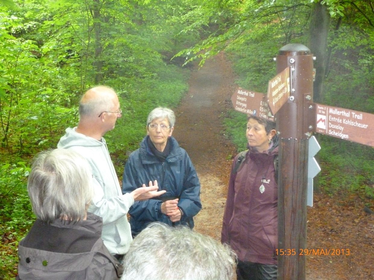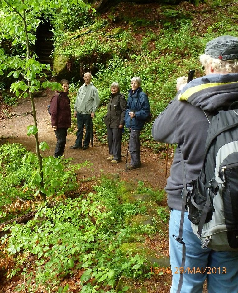 war der Seniorenclub Nordstadt auf diese interessante Promenade von 4.4 km mit dem verlockenden Titel: « Die "Kuelscheier": ein "MUST" bei ihrem Besuch in der Kleinen Luxemburger Schweiz » aufmerksam geworden, so verabredete man sich mit den beiden ortskundigen Wanderführern Armand Reuland und Fred Schaaf am 29. Mai zu einem lehrreichen Wandernachmittag. Es sollte dieses nicht nur ein simpler Fussmarsch sein, nein man wollte den Teilnehmern die Sehenswürdigkeiten um Consdorf mit seinen Felsen, deren Gängen und Verformungen zeigen und aufmerksam machen und sie durch das stockfinstere Kohlscheuermassiv hindurchführen und begleiten, so war es geplant und auch von den Wanderguides organisiert worden.