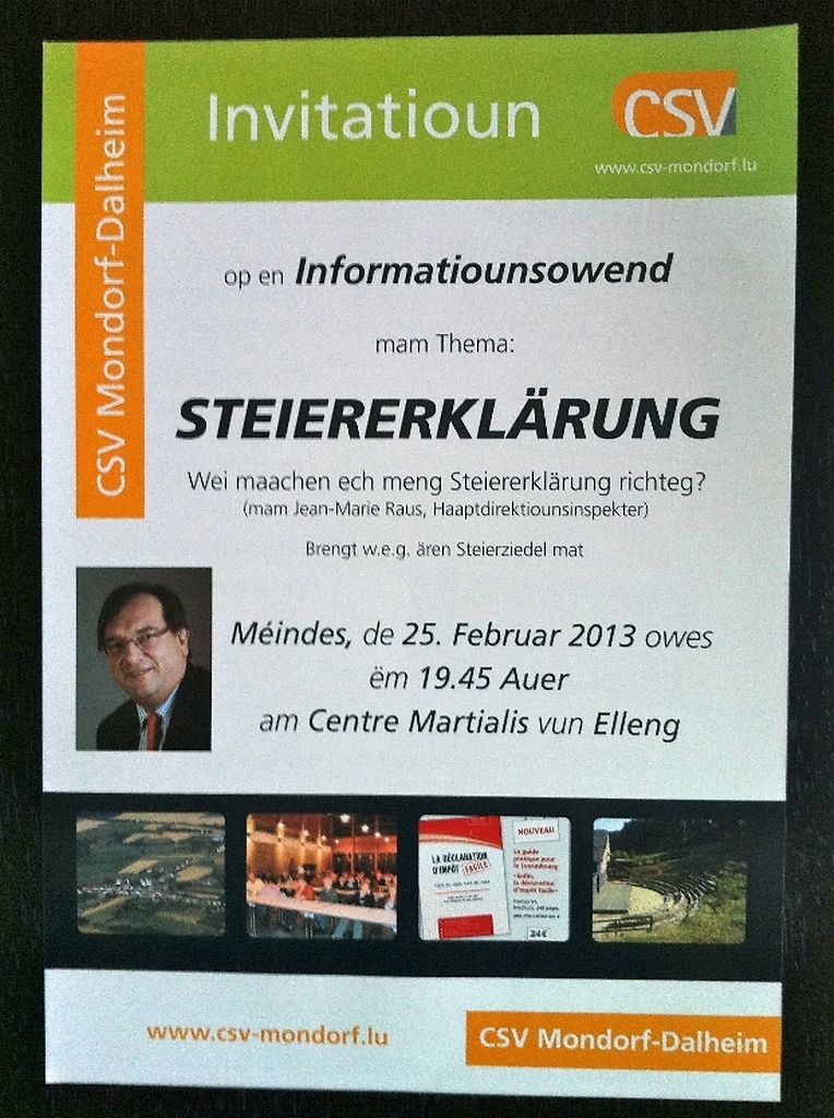 CSV Mondorf-Dalheim invitéiert ganz häerzlech , den Méindeg 25 Februar 2013 um 19.45 Auer am Centre Martialis zu Elleng op en Informationsowend mam Thema : Steiererklärung - Wéi maachen ech meng Steiererklàrung richteg -?