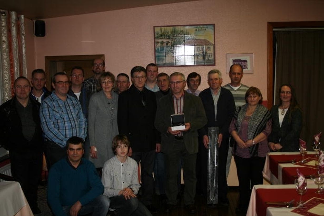 Um das Geschäftsjahr 2010 gebührend abzuschließen, traf sich die Belegschaft des Dachdeckerbetriebes Heinz aus Deiffelt zu einem gemeinsamen Essen im Café-Restaurant „A Péitesch“ in Eselborn. Diese Gelegenheit wurde wahrgenommen, um zwei treuen Mitarbeitern für ihre langjährige Betriebszugehörigkeit mit einem angemessenen Geschenk zu danken. Zu Ehren kamen Jan Wojda, der seit 15 Jahren im Dachdeckerbetrieb angestellt ist, und Jean-Claude Pinay, der bereits auf 30 Jahre Dienst im Betrieb in Deiffelt zurückblicken kann. Lucien Heinz dankte den beiden für ihre Treue und dankte auch seiner gesamten Belegschaft für ihre geleistete Arbeit im Dienst des Betriebes Heinz, der zusätzlich im Jahr 2010 sein 90-jähriges Bestehen feiern konnte.(Text/Foto: Nicole Milbert)