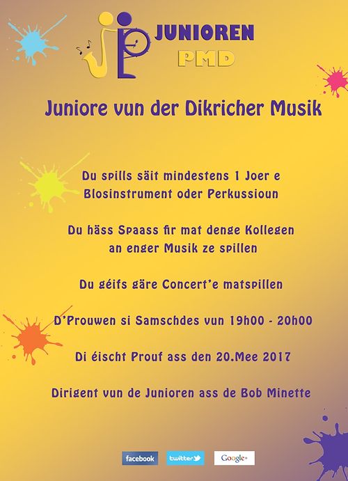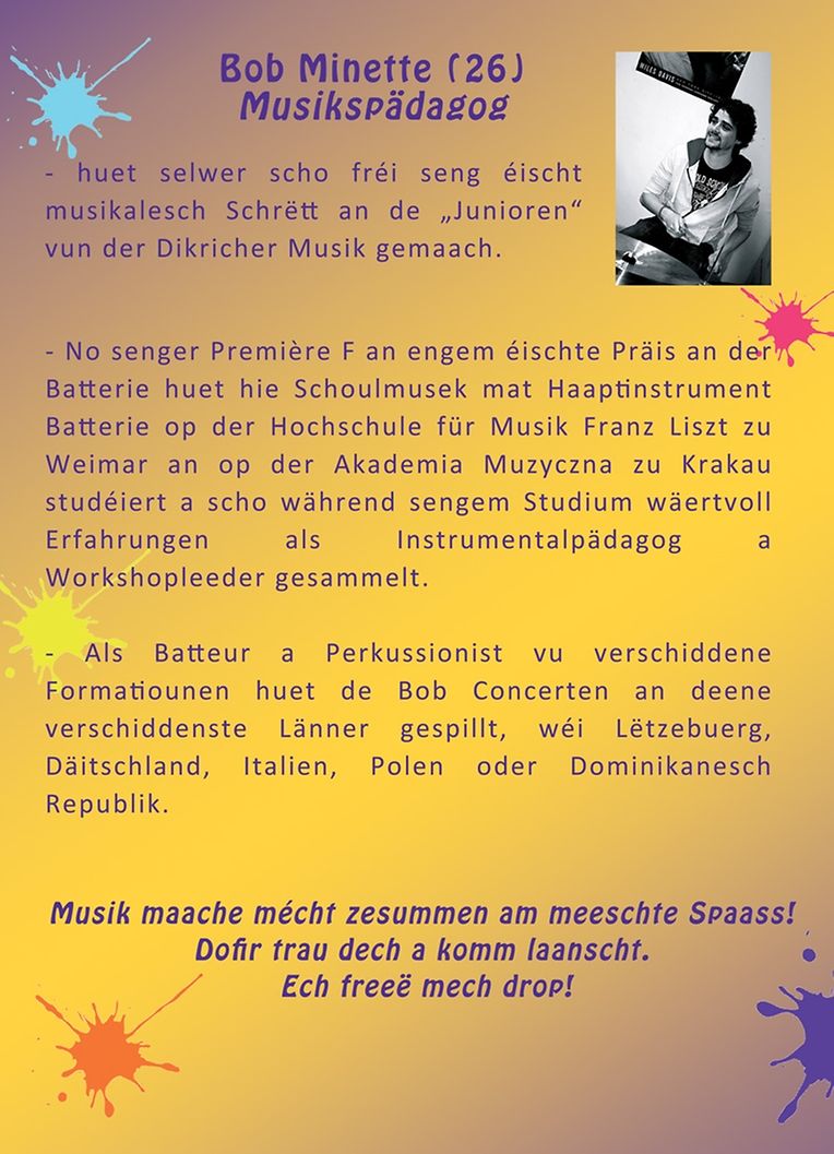 D'Philharmonie Municipale Diekirch huet flott Noriichte fir eis jonk Kollegen! Vum 20. Mee un stinn d'Junioren ënnert der Direktioun vum Musikspädagog Bob Minette!