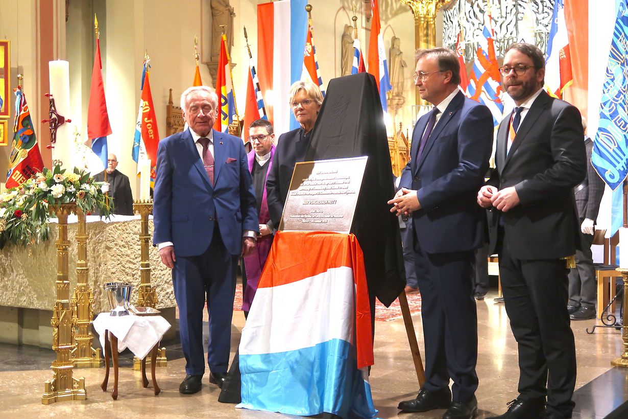 Zesummen hunn de Chamber-Vizepresident André Bauler, d’Ministerin Martine Hansen, de Buergermeeschter Charel Weiler an de Fedef-President Josy Lorent eng Gedenkplack devoiléiert, déi vum Paschtouer Romain Richter geseent gouf an deemnächst beim Kräizwee fir d’Zwangsrekrutéierten un der Sauerpromenad ubruecht gëtt. Den Här Richter huet och e Gebiet kombinéiert mat engem Friddensappell geschwat.