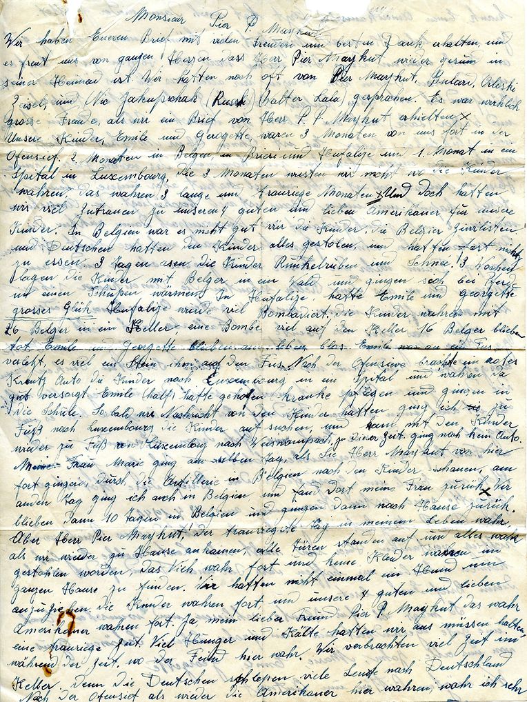 Kuerz nom Ufank vun der Ardennenoffensiv (16.12.1944) goufen déi jonk Geschwëster Georgette an Emile Thommes vu 4 amerikaneschen Zaldoten, dorënner den U.S.-Zaldot Peter P. Majkut, déi bei der Famill Thommes zu Wäiswampech aquartéiert waren, mat an d’Belsch op Houffalize a Sécherheet bruecht. Dobäi goufe Si awer vun hiren Eltere getrennt. Hir Flucht, gepräägt vun Honger a Keelt, huet se weider iwwer Brisy an Taverneux op dat amerikanescht besate Baaschtnech bruecht. D'Geschwëster goufe schlussendlech am Januar 1945 vum Roude Kräiz an d'Stad bruecht, wou si ee Mount laang gesond gefleegt goufen. Eréischt Enn Mäerz 1945, krut hire Papp Bescheed gesot, wou seng Kanner wieren. Den 23. Mäerz war d’Famill erëm zesummen. Dës emotional Geschicht ass duerch e Bréif, den den Zaldot Majkut 1947 vum Papp, dem Jean Thommes krut, reicht 2019 op d’Tapéit komm. Mat der Publikatioun vum Bréif am Lëtzebuerger Wort sinn 2019 duerch d’Hëllef vum Militärmusée d’Familljen erëm a Kontakt komm. Läschte September waren et du esou wäit, wou d’US Familljen Holland-Majkut, Orloski a Yakubchak schlussendlech op Lëtzebuerg koumen an mat der Thommes Famill eisen Musée National d’Histoire Militaire besicht hunn. Eisen Historiker, de Philippe Victor hat hinnen eng Visitt guidée vun der Expo „Ons zerschloen Dierfer“ gemaach, wou d’Geschicht vun den Thommes Kanner och erzielt gëtt. Begeeschtert vum Engagement vum Jean-Claude Thommes an dem Musée senger Aarbecht, déi perséinlech Geschichte vun der „Battle of the Bulge“ lieweg ze halen, hunn d’US Familljen Holland-Majkut, Orloski, Couet, Bastoni eis als grouss Unerkennung eng Donatioun vun 2000 $ gemaach. Bei der Iwwerreechung huet de Vice-Präsident Marc Rosch am Numm vun der Associatioun e grousse Merci ausgedréckt. Et bestäerkt eis fir mat eiser Missioun an der Erënnerungskultur weiderzefueren.