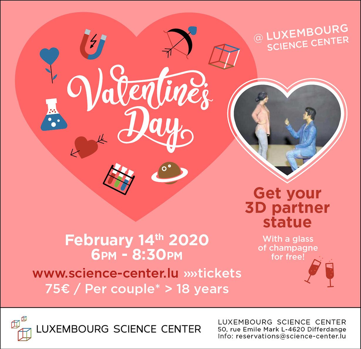 Differdange Valentines Day @ Luxembourg Science Center 14 Feb 2020 14 Feb See More 14 Feb Luxembourg Science Center Published on Monday, 10 February, 2020 at 09:32 50 Rue Emile Mark, 4620 Differdange, Luxemburg Report inappropriate content