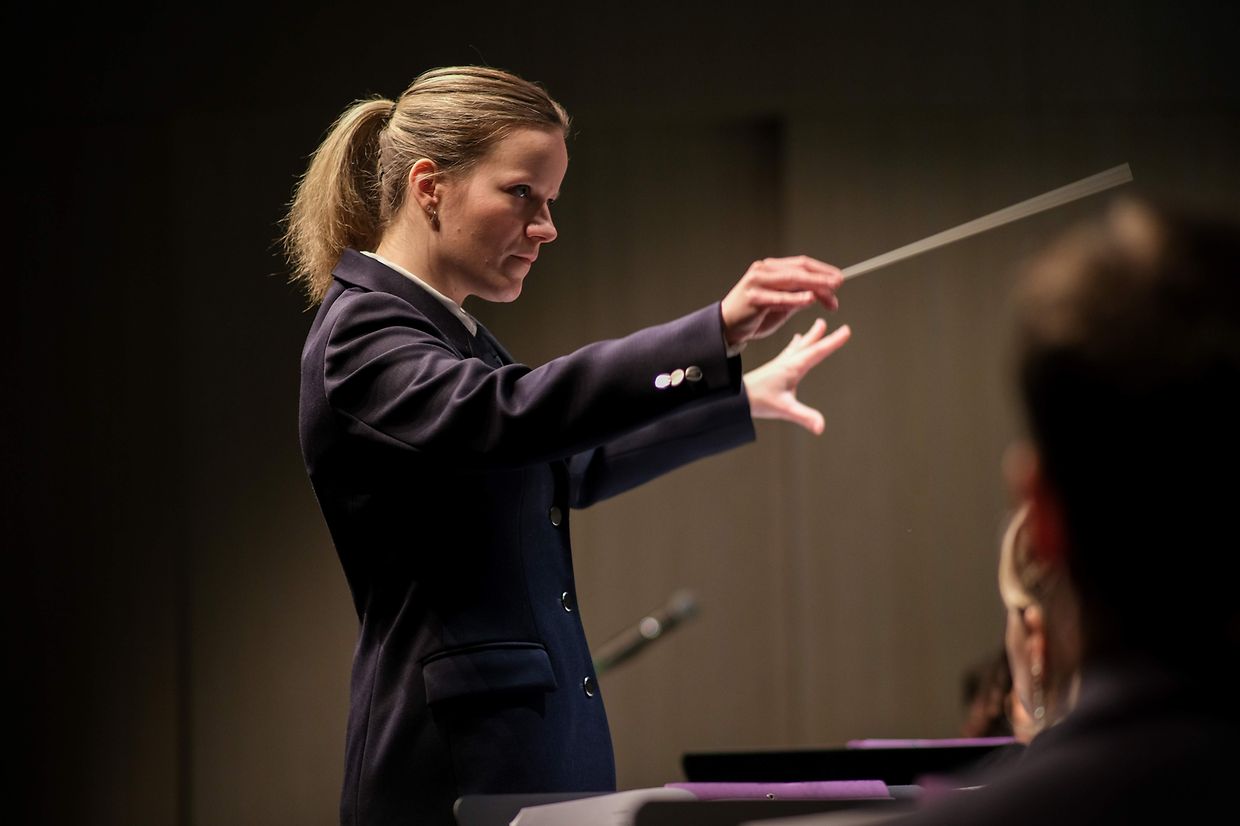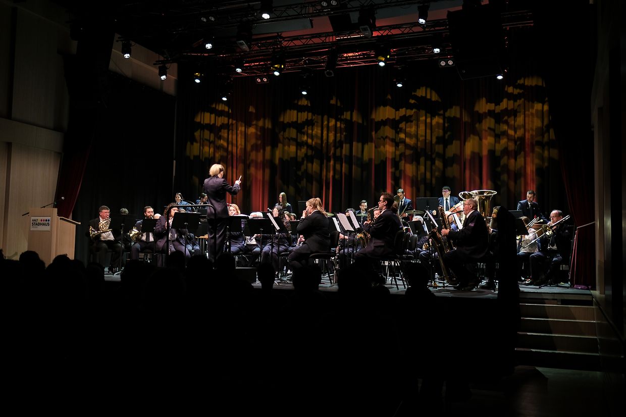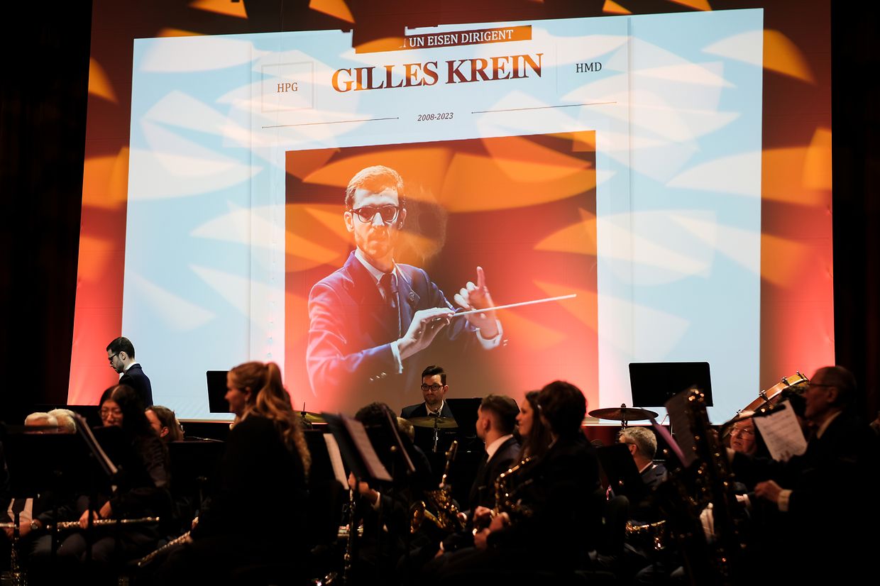 Nach 20-minütiger Pause war dann das Hauptorchester am Zug. Der Höhepunkt hierbei war wohl der gleich zu Beginn erfolgende Dirigentenwechsel. Präsident Michel Meisch hielt hierbei eine Laudatio auf den scheidenden Dirigenten Gilles Krein, der nach 9 Jahren an der Spitze des Orchesters den Entschluss traf, seinen Posten abzugeben. Er bleibt dem Orchester jedoch als Perkussionist weiter erhalten und wurde zusätzlich als Anerkennung für seine Arbeit, zum Ehrendirigenten des Orchesters ernannt. An seiner Stelle steht nun offiziell Véronique Bernar, die bereits im November das Orchester übernommen hat, und somit in der insgesamt 140-jährigen Vereinsgeschichte die erste Frau am Dirigentenpult der HMD ist. Véronique konnte ihre Qualitäten sofort unter Beweis stellen, indem sie praktisch nahtlos an die Arbeit ihres Vorgängers Gilles anknüpfte, und somit dem Publikum ein anspruchsvolles Programm bieten konnte. Dieses wurde mit der „Ouverture HPG Nr.5“ eröffnet. Ein Stück, das aus der Feder ihres Vorgängers Gilles stammt. Weiter ging es schließlich mit Stücken des Filmkomponisten Rossano Galante, der italienischen Musiklegende Gioachino Rossini, und mit als krönendem Abschluss dem Stück „Pomp and Circumstance N.4“ des Briten Edward Elgar. Durch das Programm führte hierbei wieder Roger Ianizzi, der dem Ganzen mit seiner spritzigen Präsentation den letzten Schliff verpasste.