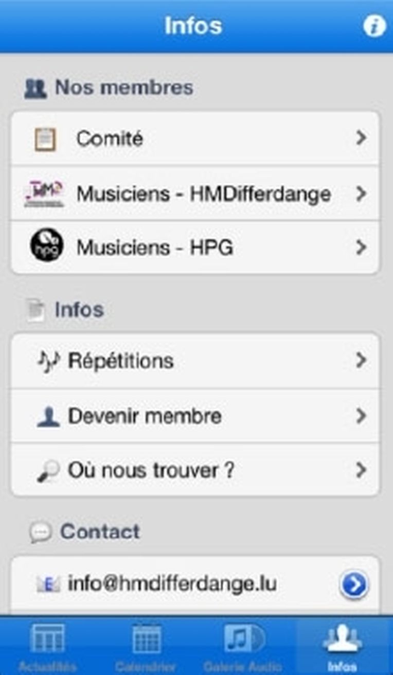 Retrouvez l'intégralité des informations de l’Harmonie Municipale de la Ville de Differdange et de l’Harmonie des jeunes Prince Guillaume grâce à une application optimisée pour les iPhones 3GS/4/4S/5 et iPod 4th/5th generation.