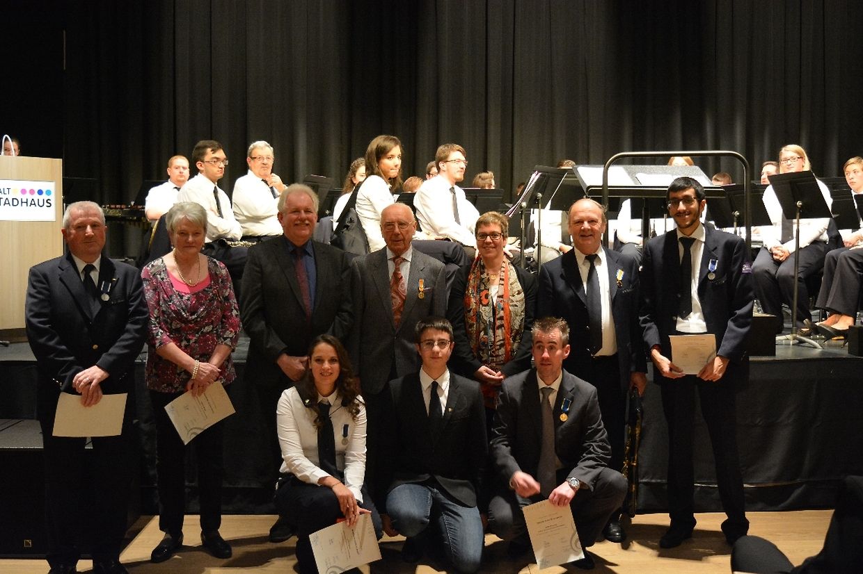 Zu diesem Anlass wurden gleich zu Beginn und in Anwesenheit der Vorsitzenden der Union Grand-Duc Adolphe Martine Deprez, die Auszeichnungen für verdienstvolle Mitglieder überreicht. Hierbei handelte es sich unter anderem um das „Insigne” für fünf Jahre Engagement für Louis Elsen und um die „Médaille de mérite en bonze” (10 Jahre) für Margot Tenconi. Sabrina Lentz, Daniel Lepore, Francis Majoie und Pereira Michel wurden für ihr zwanzigjähriges Jubiläum mit der „Médaille de mérite en argent” ausgezeichnet. Des Weiteren erhielt François Meisch für dreißig Jahre Aktivität die „Médaille de mérite en vermeil”. Zuletzt wurden zwei weitere Mitglieder der Harmonie Municipale de la Ville de Differdange für ihre besonderen Leistungen ausgezeichnet. François Goergen wurde die Ehre zu Teil die „Médaille en vermeil Grand-Duc Adolphe” zum 60. Jubiläum entgegen zu nehmen. Albert Hobscheit wurde seinerseits für 70 Jahre Aktivität bei der HMDifferdange mit der „Médaille en vermeil Grand-Duc Adolphe avec palmette” ausgezeichnet.