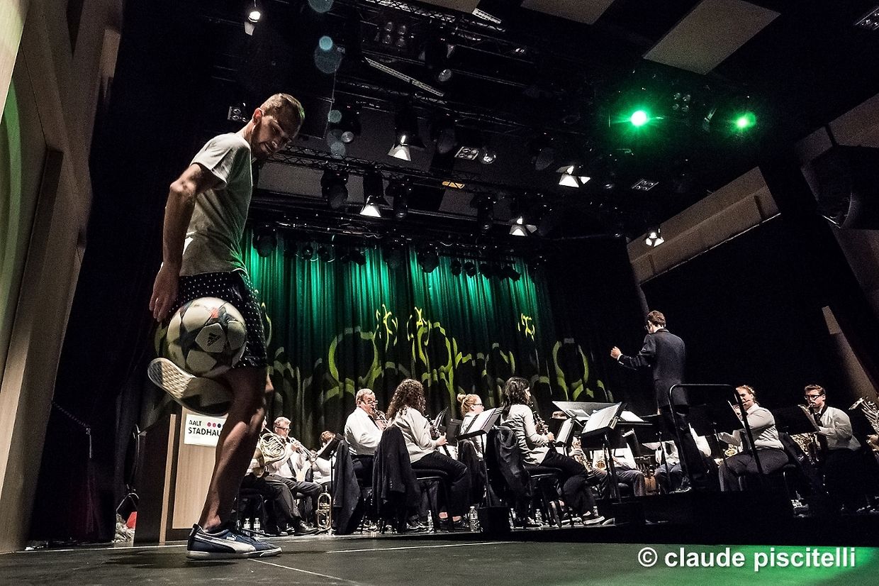 Ein außergewöhnliches Programm stand am 8. Mai im Differdinger Kulturzentrum „Aalt Stadhaus“ an, als die Harmonie Municipale de la Ville de Differdange mit ihren 40 Musikanten einen sportlichen Sommer einläutete. Der Dirigent der Differdinger Stadtmusik, Gilles Krein, nahm die Hörerschaft auf eine musikalische Reise durch die Fußballwelt mit. Das Konzert begann mit der wohl bekanntesten Fußballhymne des letzten Jahrzehnts: der UEFA-Championsleague-Hymne. Auch andere Fußballklassiker durften an diesem sommerlichen Frühabend nicht fehlen. So stimmte man beispielsweise den Hit der Sportfreunde Stiller „54, 74, 90, 2006“, den offiziellen Song der EM1996 „Football’s coming home“ sowie den Hit der WM 1998 in Frankreich „Carnaval de Paris“ an. Begleitet wurde die HMDifferdange dabei von dem Fußball-Freestyler Sven Fielitz.