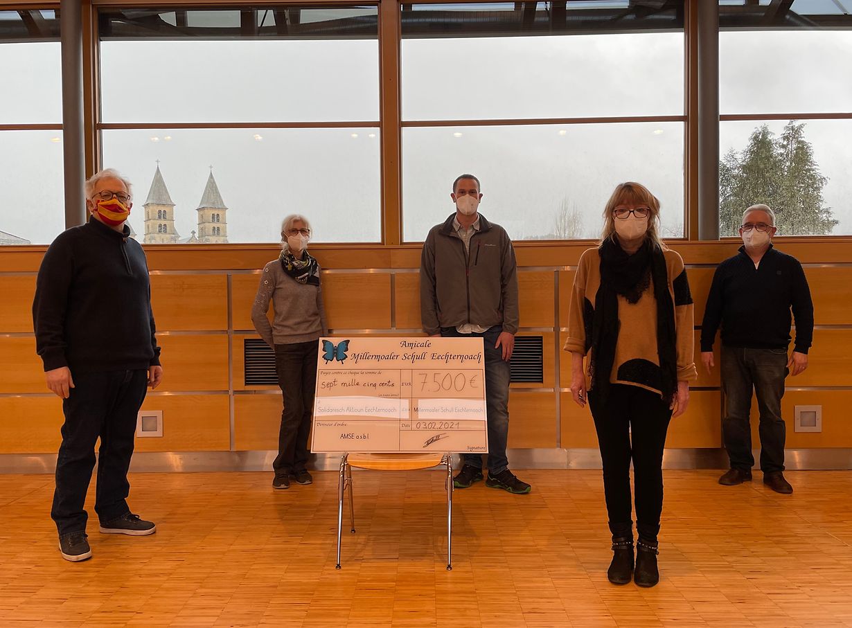 Den 3. Februar 2021 huet d’A.M.S.E (Amicale Millermoaler Schull Eechternoach) e Scheck fir d’„Solidaresch Aktioun Iechternach“ am Wäert vun 7500 Euro iwwerreecht, an daat trotz de schwieregen Ëmstänn vun dësem Corona-Schouljar, wou net vill Veranstaltungen konnte stattfannen.