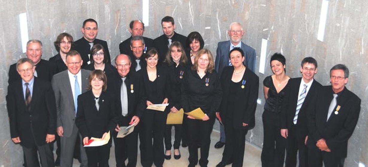 Viele Besucher hatten sich auch dieses Jahr zum Konzert „Music Open“ der „Harmonie Municipale Echternach“ unter der Leitung ihres Dirigenten Daniel Heuschen im Trifolion eingefunden. Den zweiten Teil des musikalischen Events bestritt die Harmonie aus Grevenmacher mit ihrem Dirigenten Claude Weiland. Anschließend wurden mehrere verdienstvolle Musikanten ausgezeichnet. Zusammen mit Schöffe André Hartmann überreichten Ugda-Vertreter Gaston Gengler und Präsident Fernand Theisen Medaillen für langjährige Mitgliedschaft an Katrin Hagen, Charlotte Wengler und Joé Wengler (fünf Jahre), Nick Bohnenberger, Luis Da Silva Rocha, Julie Kersch, Ronny Osweiler und Nathalie Wies (15 Jahre), Gilles Eiffes, Emile Steinmetz und Philippe Steinmetz (20 Jahre), Monique Hoffmann und Chantal Koch (30 Jahre), Serge Ceccon, Lucien Diederich und René Lahr (50 Jahre). (Text: Foto: Lucien Schiltz)
