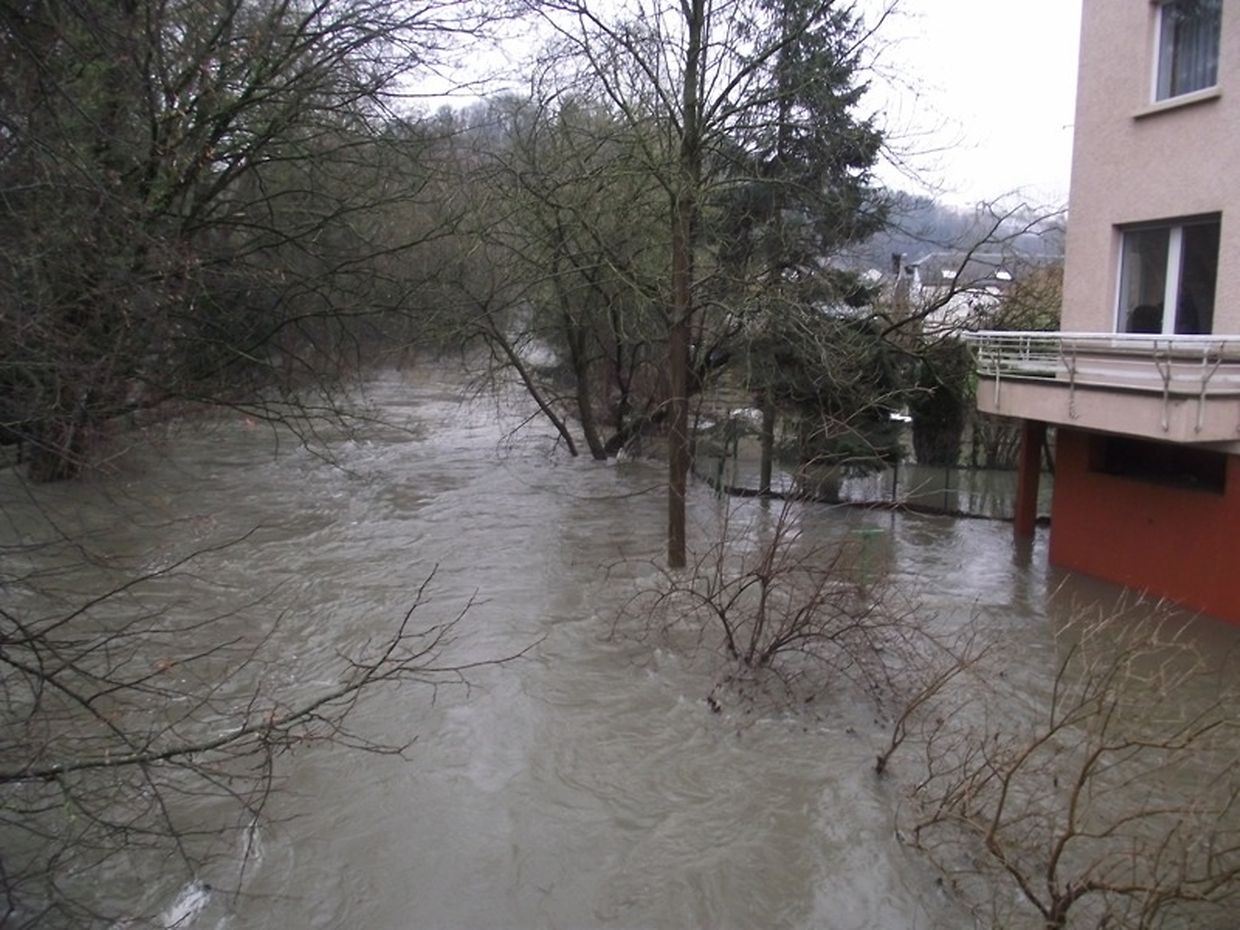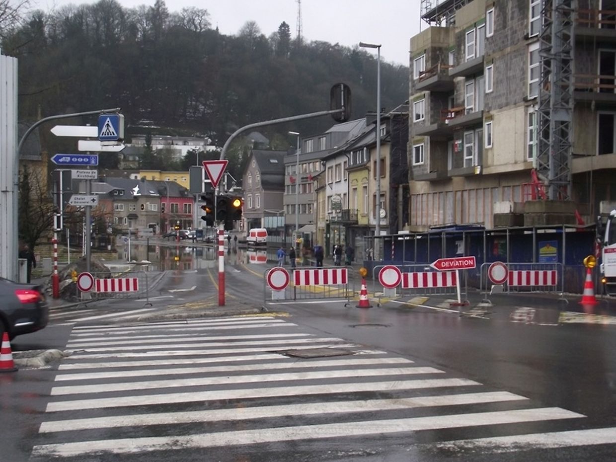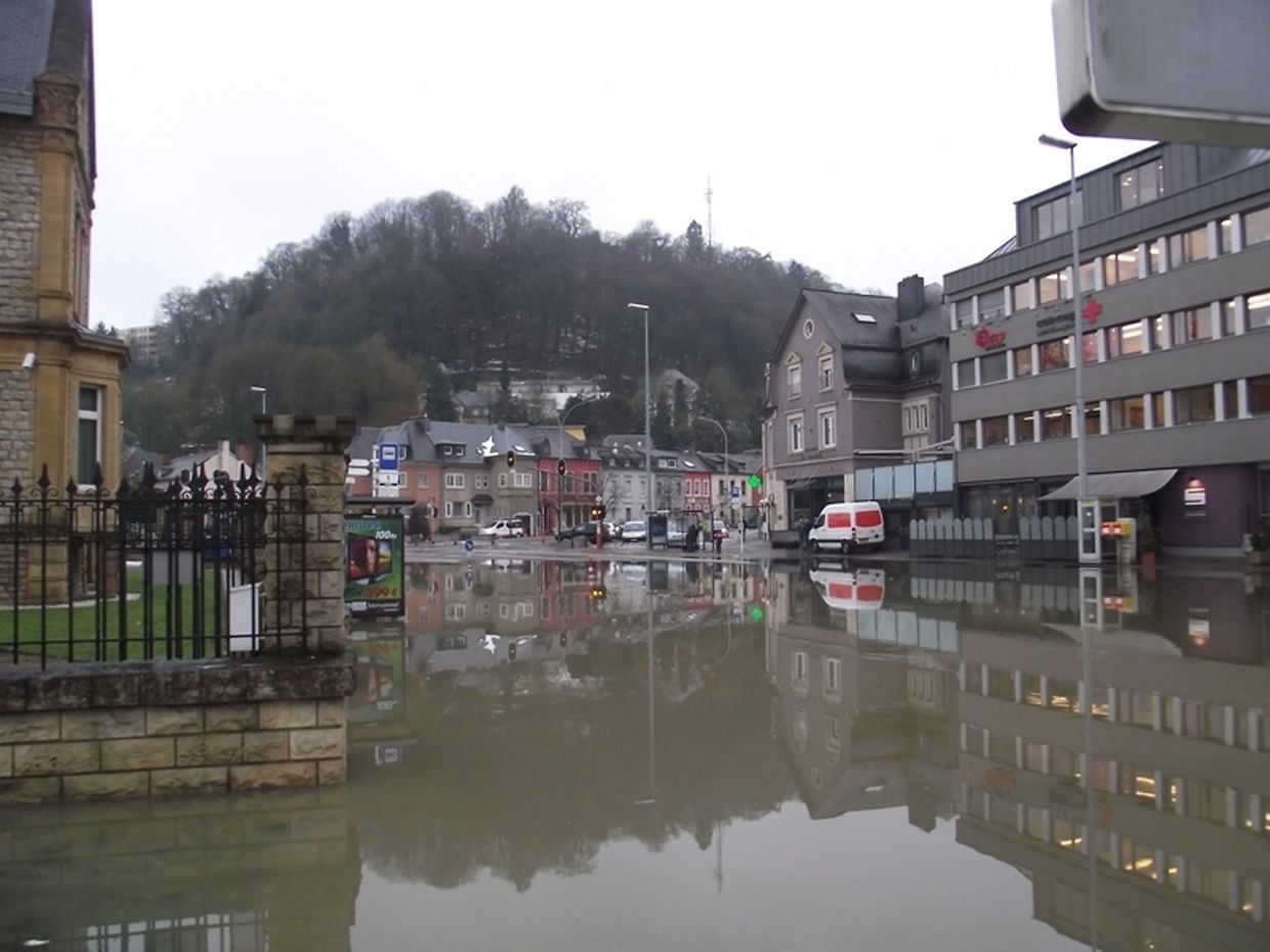 D'Geschäfter op der Place Dargent haten haut naischt ze laachen, well se haten d'Féiss naass. Sandsäck a Stapelversich waren um Programm. Bis ongeféier 3 Auer de Metteg wor d'Place Drgent zou.D'Waasser stung an der Mëtt vun der Strooss bis bal zu de Kneien.