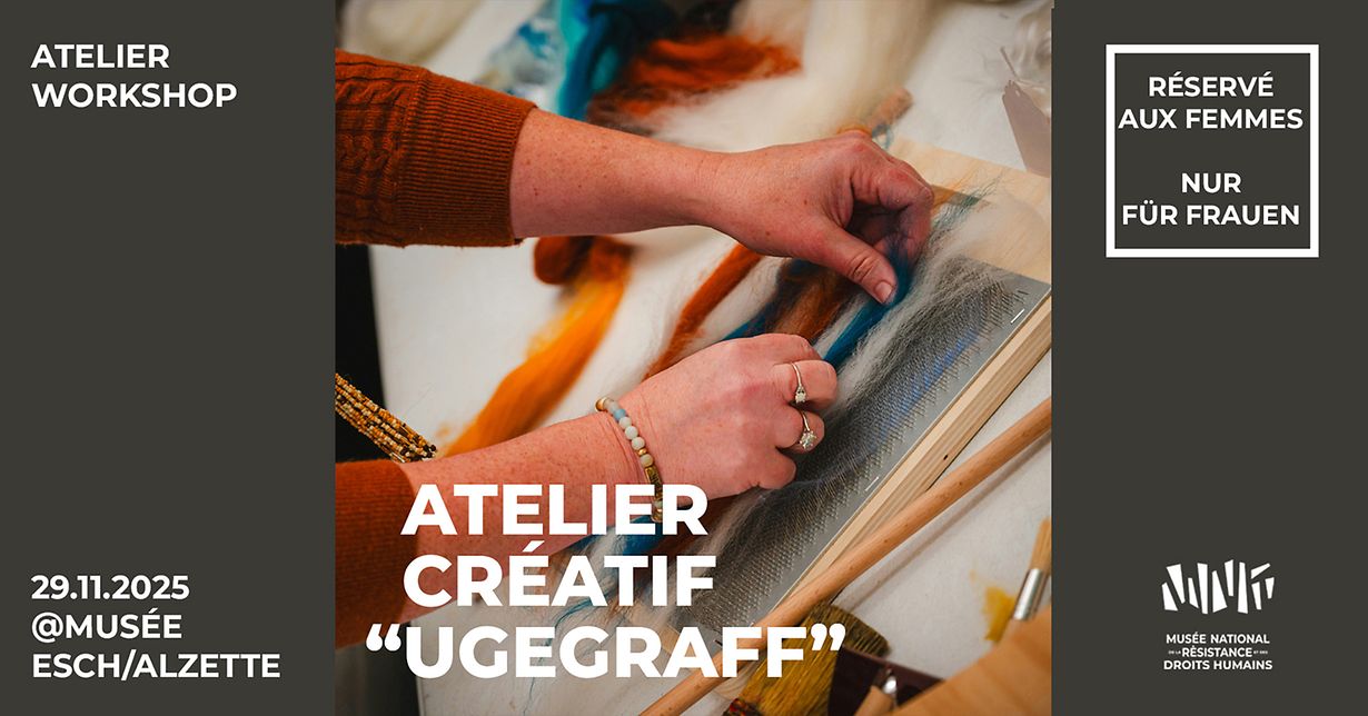 Dans le cadre de l’exposition Ugegraff, le Service Egalité des Genres, Diversité & Vivre-ensemble Interculturel de la Ville d’Esch, le Musée National de la Résistance et des Droits Humains et Lëtz Art asbl invitent à un atelier créatif pour toutes les femmes qui souhaitent se réapproprier leur récit à travers la création artistique ou qui ont envie d’explorer un moyen d’expression autre que la parole pour soutenir leur parcours de guérison.