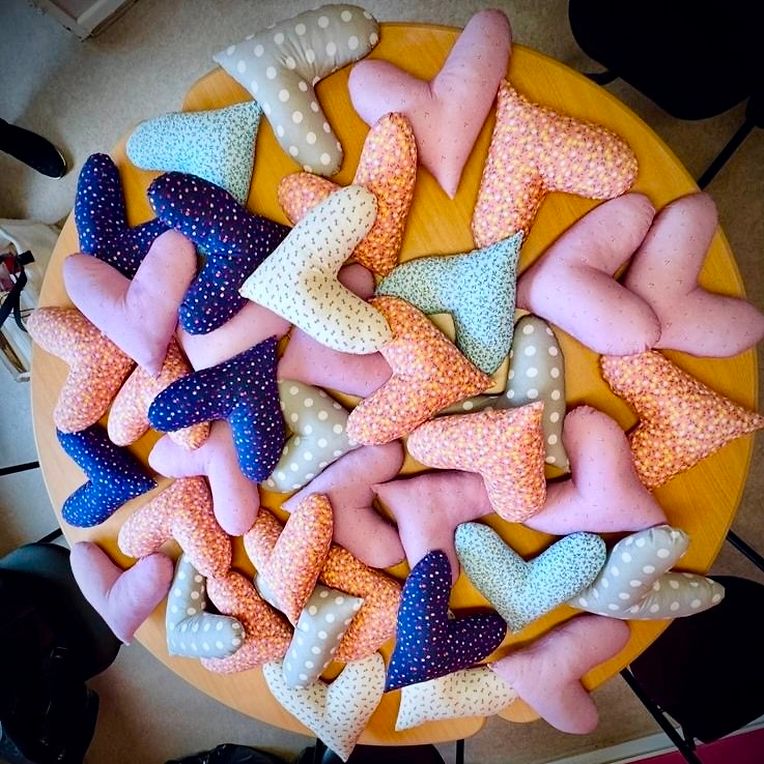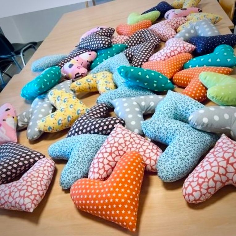 Schon zanter dräi Joer bastelt d‘Psychiatrie Häerzkëssen fir Patientinnen an der Onkologie. Dës Këssen aus Stoff a Kotteng sinn un d'Form vum Ënneraarm ugepasst. Hir Positioun reduzéiert Péng, déi mat der Broschtkriibschirurgie verbonne ass, an hir Häerzform ass eng moralesch Ënnerstëtzung.