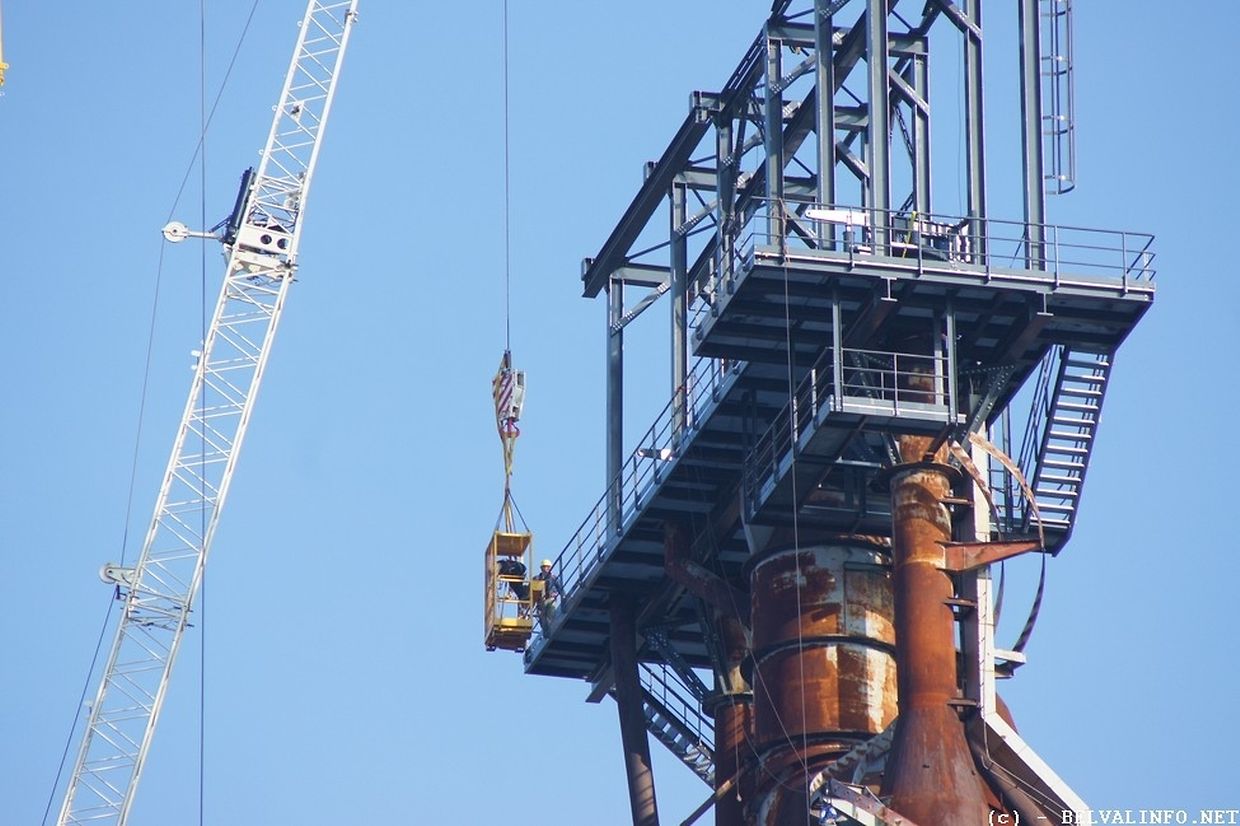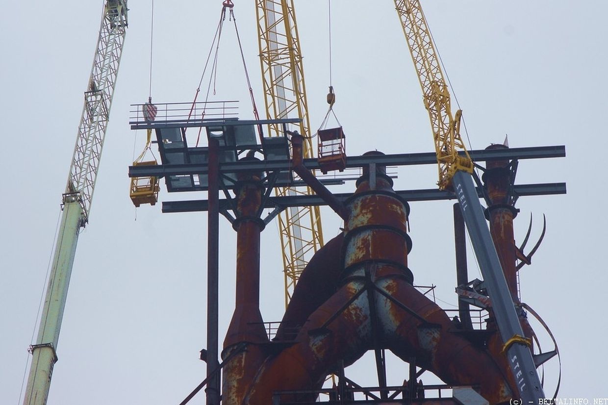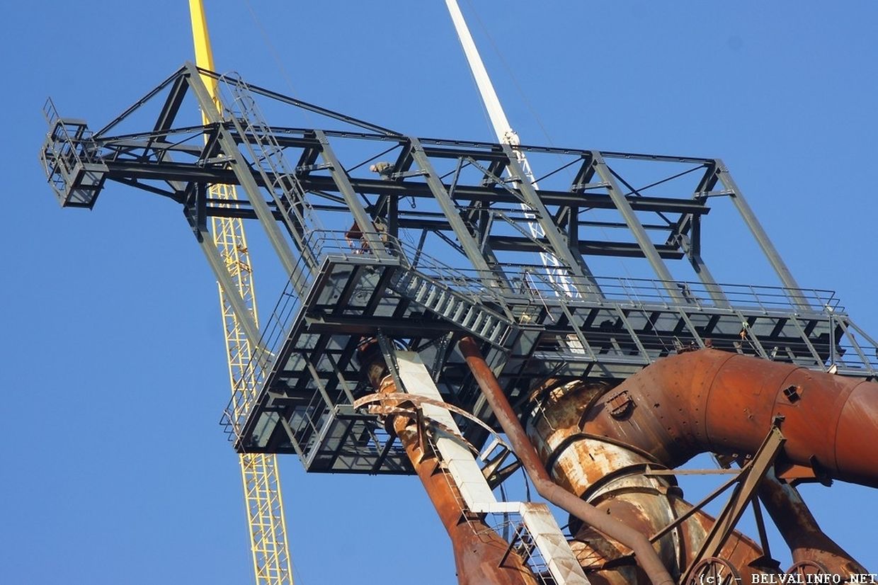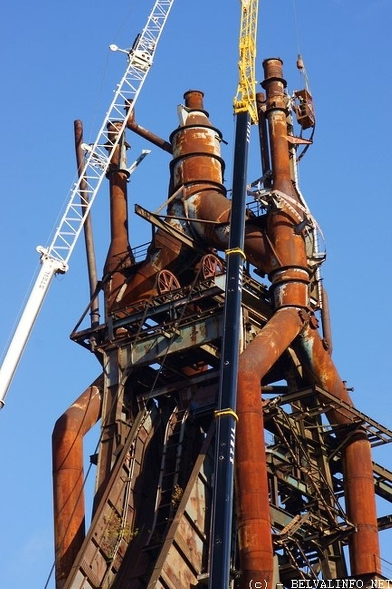 Hochofen B ist seit einigen Wochen von mehreren Kränen umringt, die einer Spezialfirma ermöglichten, die alte „Bleeder“-Bühne wieder auf der Spitze von Hochofen B zu montieren. Die „Bleeder“ sind die ehemaligen Ventile des Hochofens. Die alten Elemente waren verrostet und wurden 2008 abgebaut, um sie zu restaurieren. Die Monteure liessen sich dabei in winzigen Kabinen von den Kränen in die Höhe hiefen, um in 80 Meter Höhe die nicht ungefährliche Montage der Einzelteile der neuen Bleeder-Bühne durchzuführen.