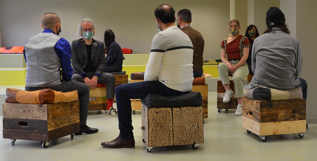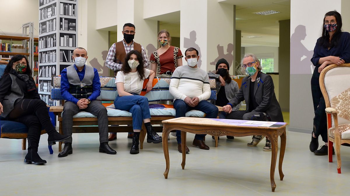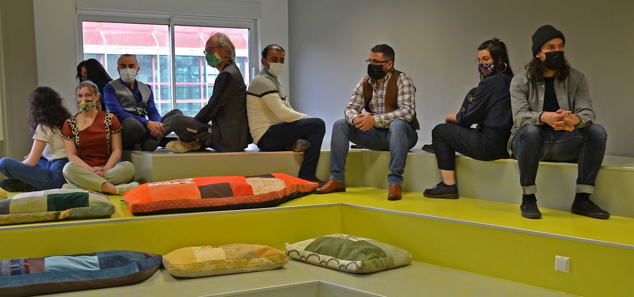 Sur cette base, l'équipe BENU a créé 10 conteneurs poufs roulants, fabriqués à partir de chutes de bois et de métal, de restes de peinture en combinaison avec des roulettes usagées et de nouveaux coussins fabriqués à partir de chutes de cuir et de restes de la production de matelas de l'entreprise partenaire Stoll (Ehlerange). En outre, il y a 2 canapés dans lesquels des portes de placard, du bois de construction propre, de la ferraille sont combinés avec des coussins d'assise fabriqués à partir de rideaux, de vêtements usagés, de couvertures et de restes de tissu provenant de la production de vêtements BENU COUTURE (ZeroWaste · ZéroDéchet). Les 3 chaises Voltaire ont été entièrement décapées, poncées puis retapissées avec un tissu patchwork de BENU COUTURE et des restes de tissus d'ameublement. Le bois a été huilé et peint suivant les idées des artisants-artistes BENU. Les deux tables d'appoint ont été fabriquées dans les moindres détails, un patchwork de restes de bois de l'atelier BENU (ZeroWaste · ZéroDéchet). Enfin, une série de coussins différents a été produite pour les escaliers de la nouvelle bibliothèque. Ici aussi, seuls des tissus de haute qualité, sélectionnés et résistants ont été employés, remplis avec les restes de la production de vêtements de l'atelier et de la production de matelas de la société Stoll. Comme nous l'indique le bibliothécaire, les meubles et les coussins sont très particulièrement appréciés par les étudiants.
