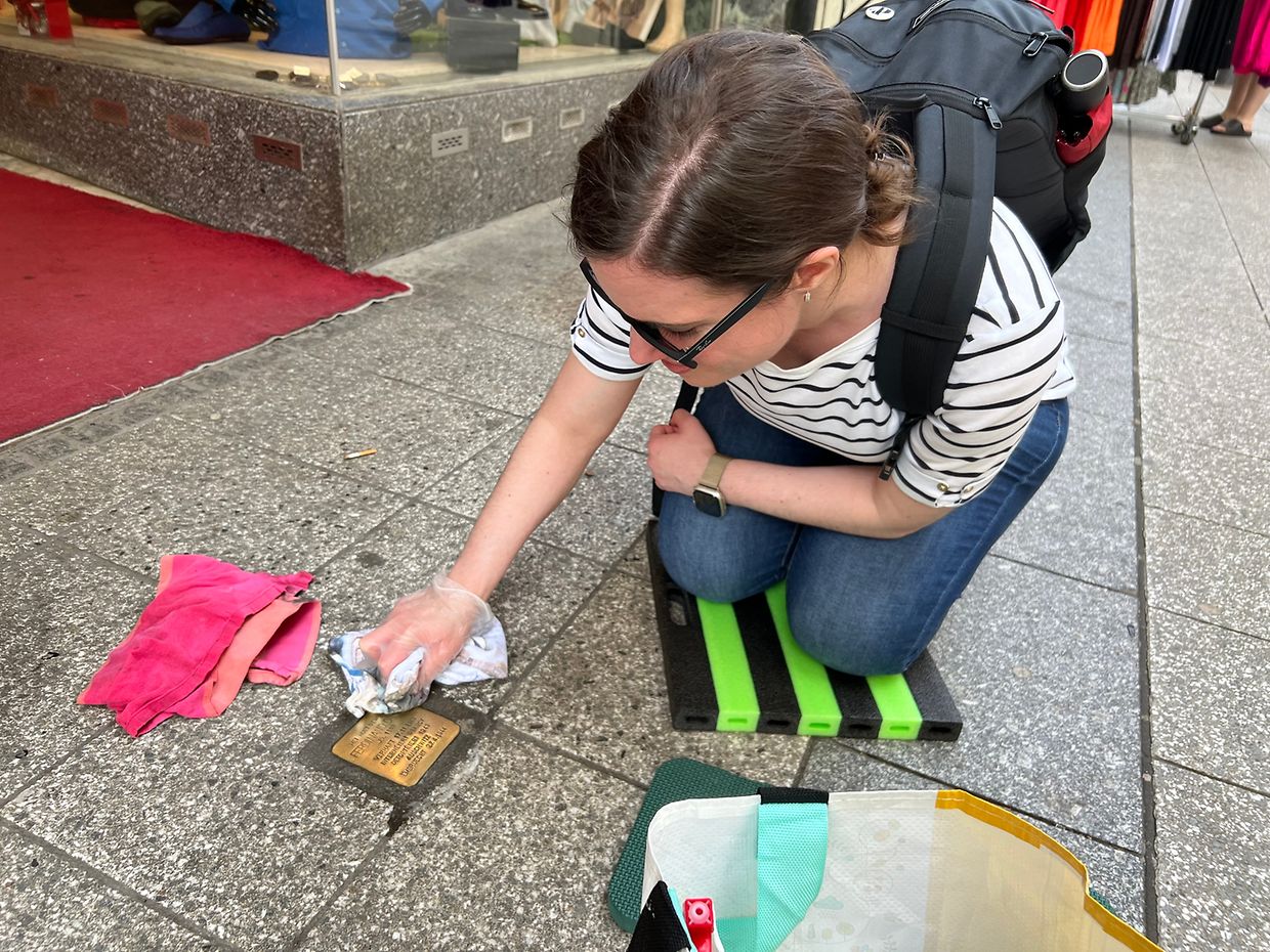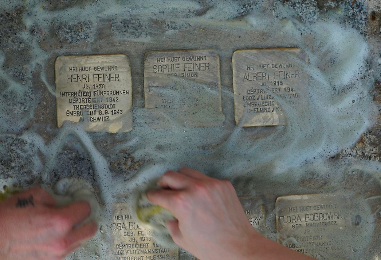 « Frënn vum Resistenzmusée « gemeinsam mit Angestellten des Museums den 31 Stolpersteinen wieder zu neuem Glanz verholfen.