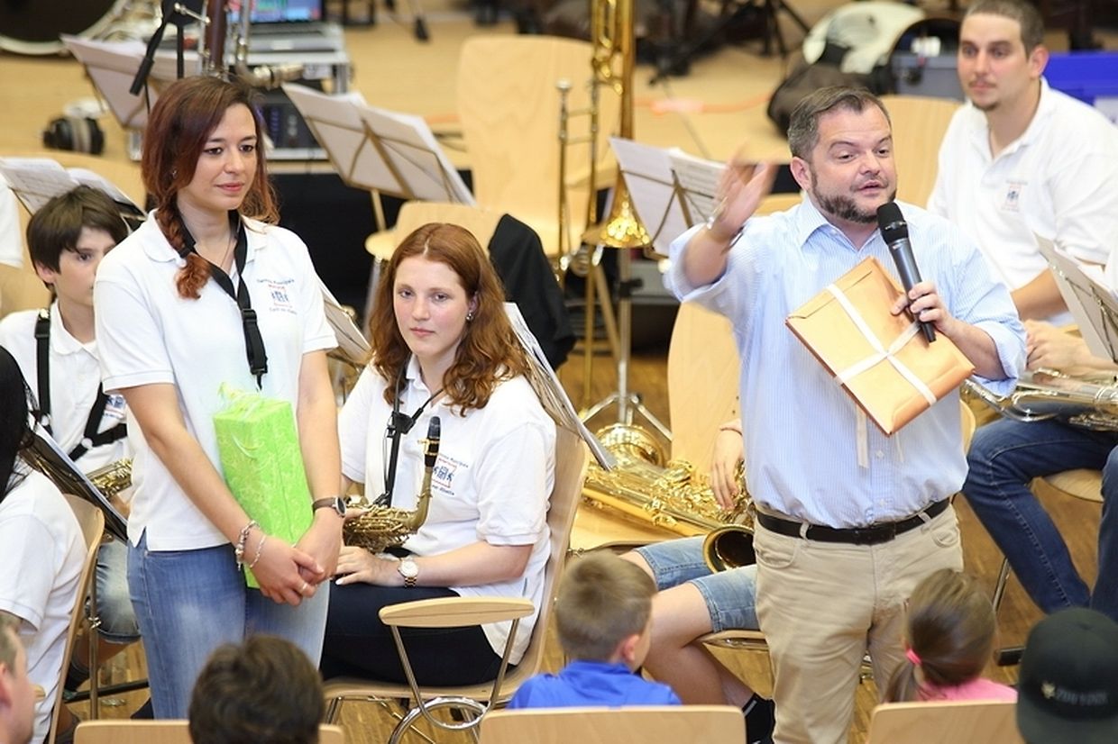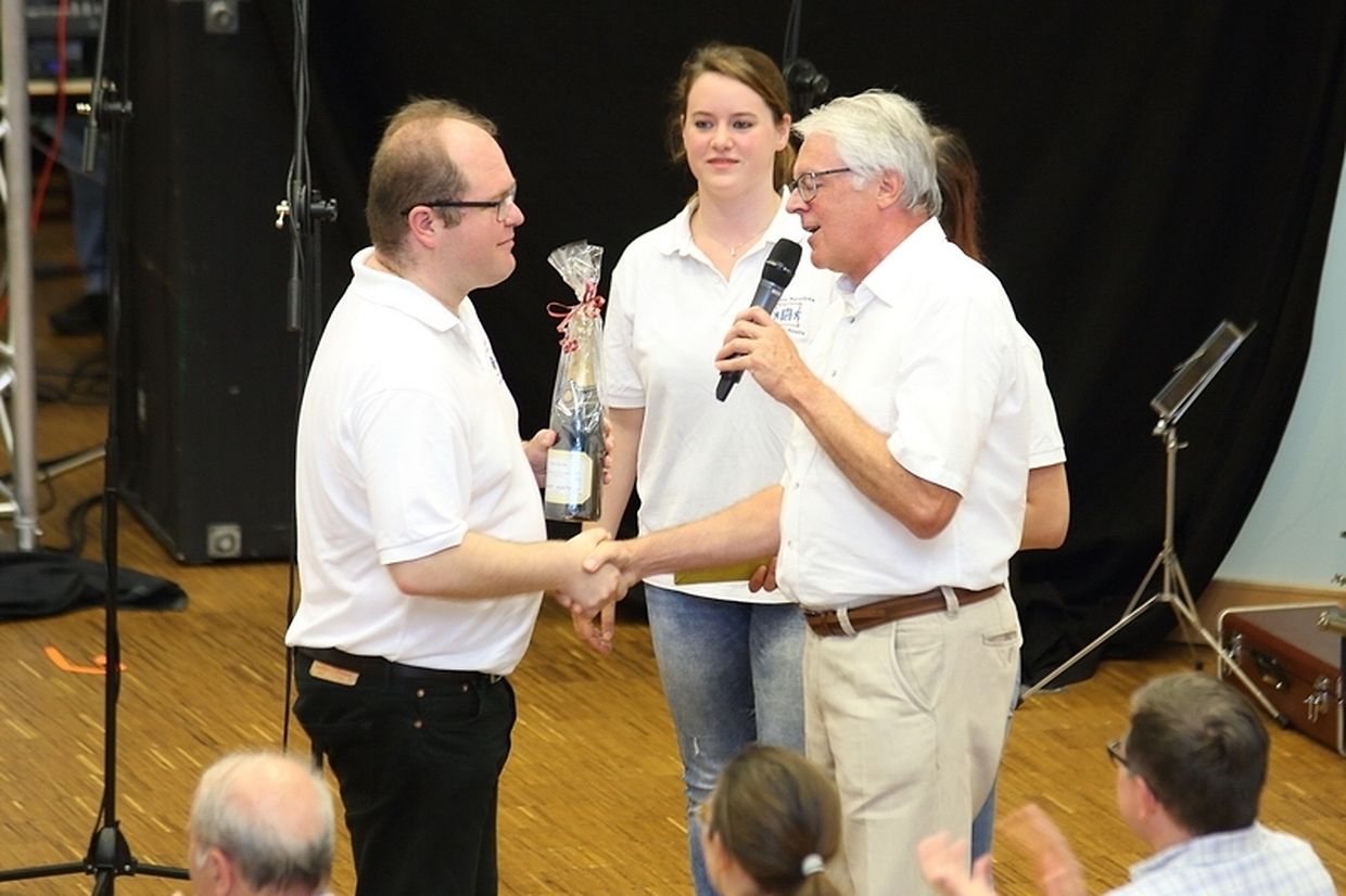 Seit Juli 2001 steht das Jugendorchester unter der Leitung von Yves Schmartz, der damals „mal kurz für 6 Monate übernehmen sollte“. Emile Werner, Präsident der HME, und Dan Codello gingen kurz auf die Verdienste des Dirigenten und den wichtigen Stellenwert der Jugendarbeit in unserer heutigen Zeit ein und überreichten dem Jubilar unter großem Beifall ein passendes Geschenk.
