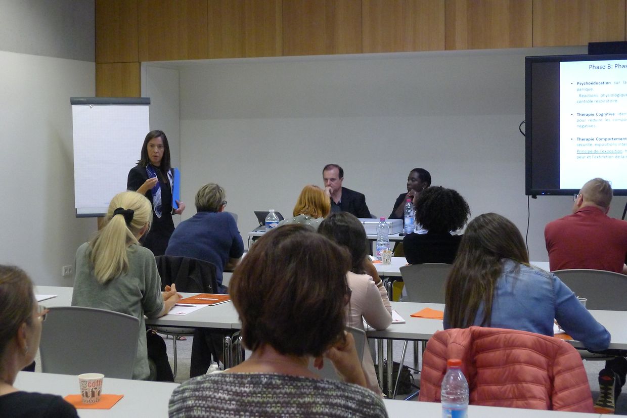 Anschließend, folgte ein Vortrag über die begleitende Rolle des Fachkrankenpflegers für Psychiatrie bei verhaltenstherapeutischen Gruppen zur Behandlung von emotionalen Störungen. Dr Le Saint und das Team der “Clinique des troubles émotionels” des Centre Hospitalier du Luxembourg boten den Teilnehmern einen Einblick in die Inhalte psychoedukativer Gruppen. Die dargestellten Beispielen enthielten praktische Übungen für Betroffene mit Angst- , Ess-störungen oder Zwangserkrankungen. Diverse Einschätzungsskalen für Angst und Depression wurden in diesem Zusammenhang vorgestellt.