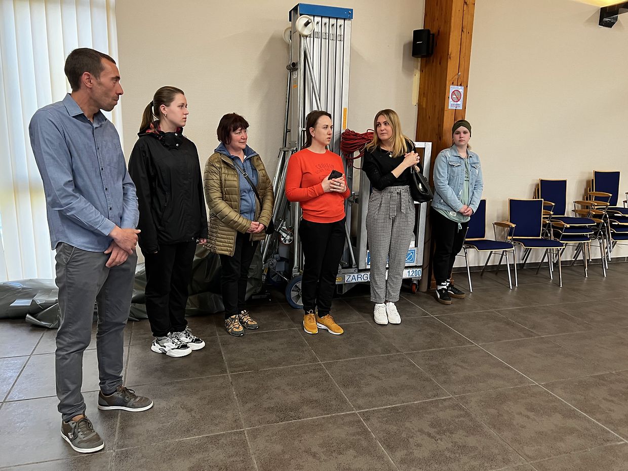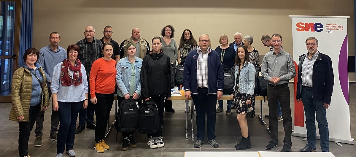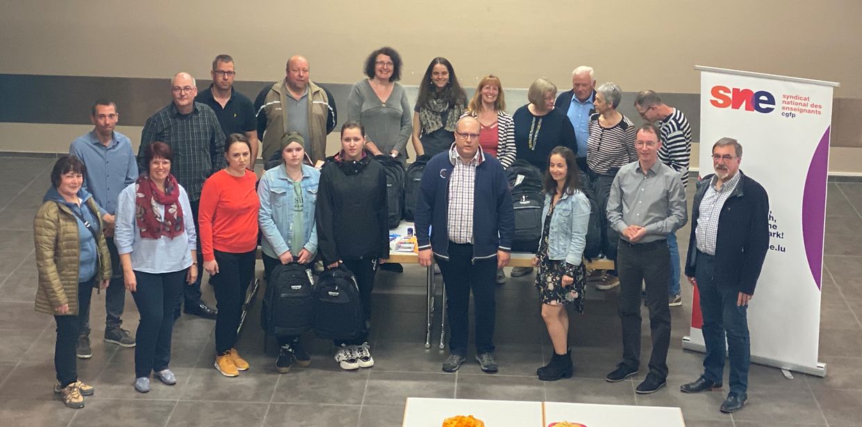 Während enger klenger Feier Donneschdes, den 28. Abrëll hunn d’Membren Loewenstein, Vesque a Mergen vum SNE, dëst Schoulmaterial zu Eeschwëller an Empfang geholl. Hinnen dofir ee grousse Merci. Déi zwee éischt Schoulsäck gungen deen Owend, stellvertriedend fir all déi anner, un zwou Schülerinnen, déi säit elo gutt zwee Méint mat hirer Mamm een neit Doheem beim Tom Malget zu Eeschwëller fonnt honn. D’Famill war och den Owend vum Concert vun de Stëmmungsbléiser am Sall present.