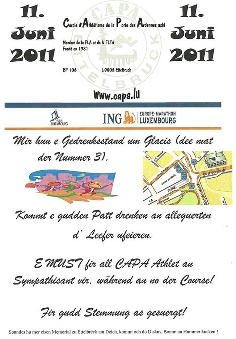 Auf den lokalen Leichtathletik Verein kommt ein sehr arbeits und ereignisreiches Pfingstwochenende zu. Am Samstag (11.6.2011) ist man ab 17.00Uhr im Rahmen des ING Luxembourg Marathon auf dem Glacis mit einem Getränkestand vertreten. Es werden nicht nur diverse Getränke (leckeres Bier unseres Sponsors Bofferding) ausgeschänkt, auch werden die Läufer mit vollem Einsatz angefeuert. Am Tag darauf richtet man das alljährlich hochkarätig besetzte Werfermeeting "Mémorial Kops, Ludivig & Reuter" aus. Auch in diesem Jahr wird wieder das "who is who" der internationaler und nationaler Werferelite im Deich präsent sein. Bereits gemeldet haben der niederländiche Meister im Hammerwerfen und 3 englische Diskuswerfen, welche die Norm für die WM erzielen wollen.