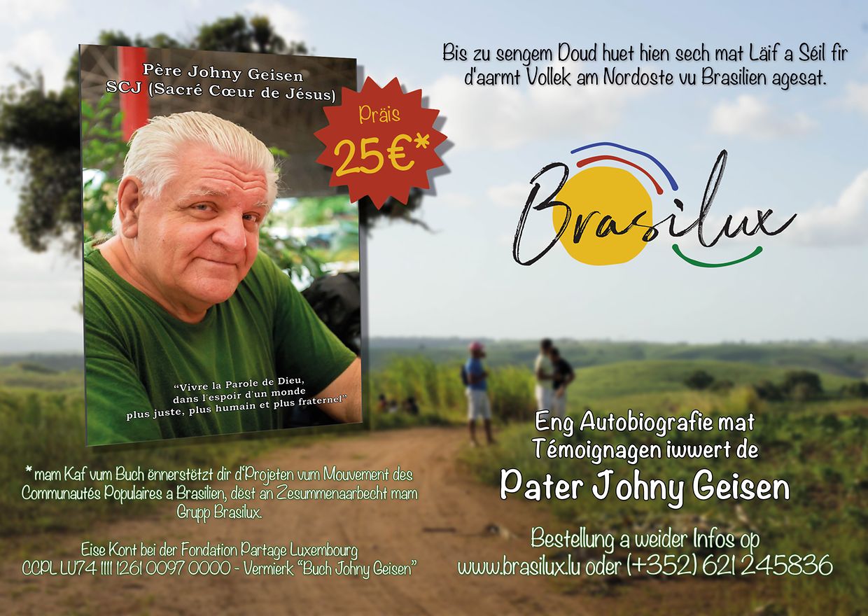 De Pater Johny Geisen: 1944 gebuer zu Lëtzebuerg, opgewuess zu Béiweng am Réiserbann, 1969 éiweg Profess als Herz Jesu Pater (SCJ) zu Clairefontaine, 1971-2016 geschafft am Nordoste vu Brasilien, wou hien sech 45 Joer laang mat Läif a Séil fir d’aaremt Vollek agesat huet. Dëst geschitt haut besonnesch duerch seng Bewegung