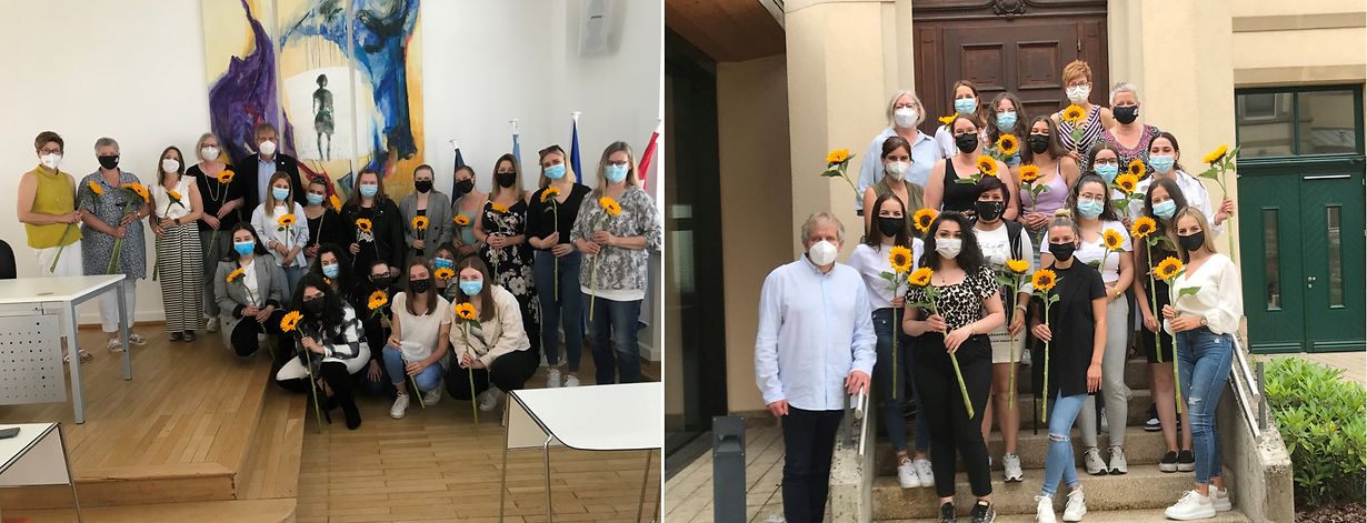 Well si awer net einfach esou aus der Schoul sollen verschwannen, koum op hirem leschten Schouldag d‘Direktioun vun der Ecole Privée Sainte-Anne si besichen. An enger klenger Zeremonie kruten si eng Sonneblumm an e Kräiz. Den Direkter vum Sainte-Anne, Georges Kayser, huet hinnen ganz vill Gléck fir hiren Examen an fir hiert weidert Beruffsliewen gewënscht an duerno gouf natierlech och eng Foto zur Erënnerung gemaach.