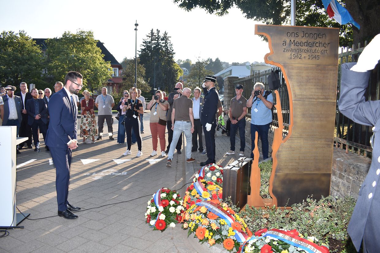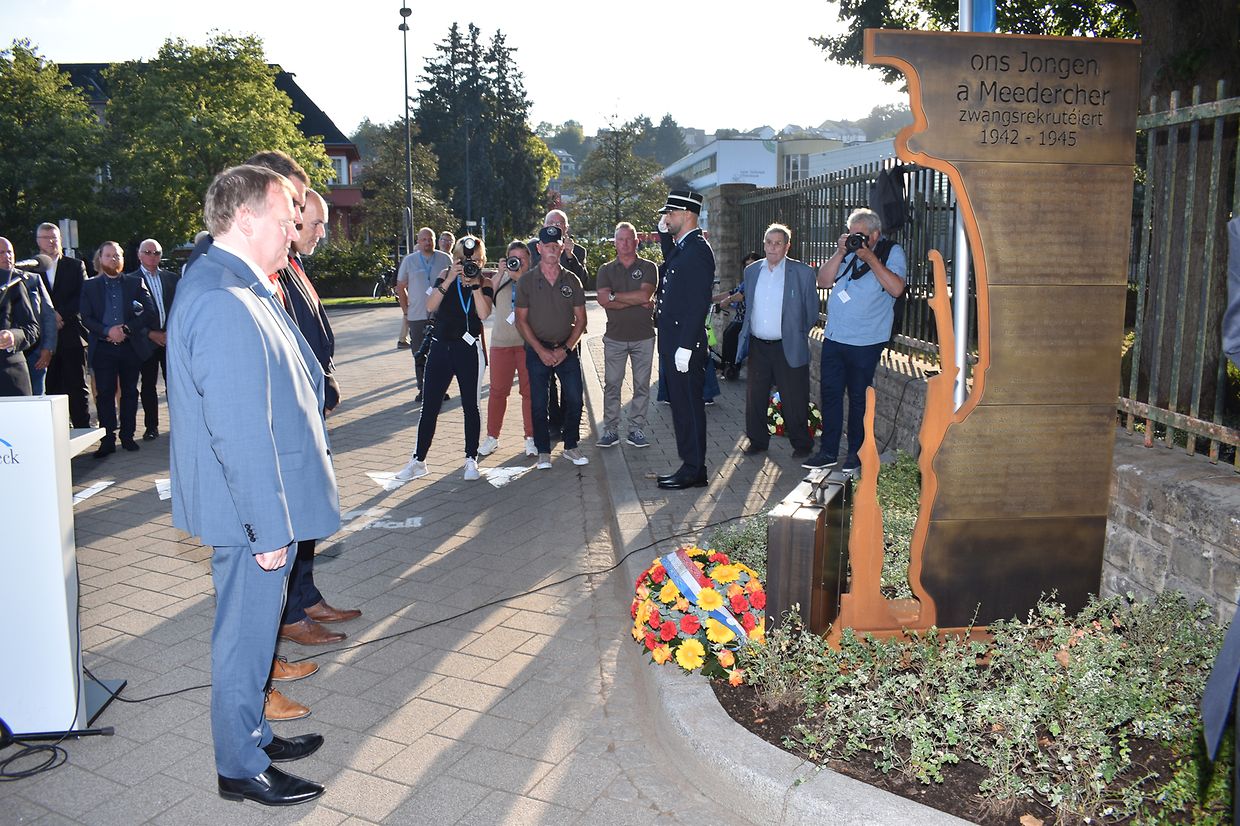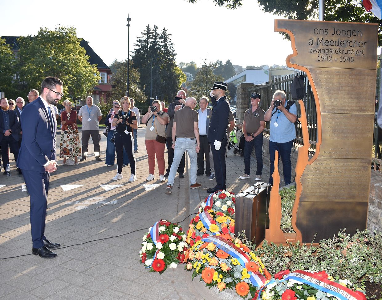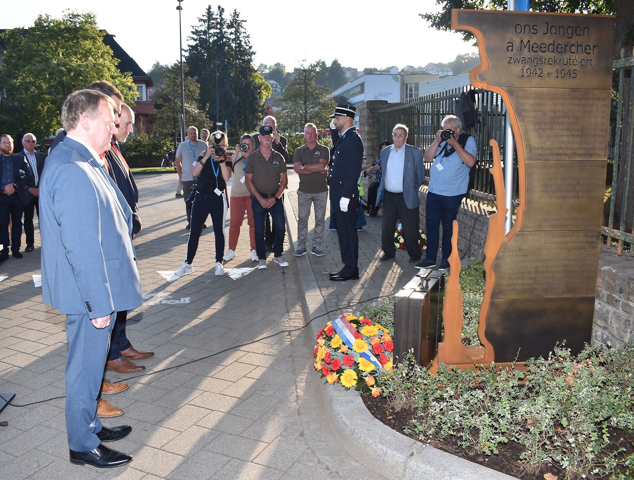 Bei der Neugestaltung der Kreuzung avenue Salentiny-rue de l’Ecole Agricole in Ettelbrück wurde auf Vorstoß des lokalen Vorstandes der Zwangsrekrutierten diese am 31. Oktober 1987 im Gedenken an die Zwangsrekrutierung im Zweiten Weltkrieg in „Place de la jeunesse sacrifiée“ umgetauft. Nun wurde wenige Meter davon entfernt ein Monument eingeweiht zur Erinnerung an die aus Ettelbrück stammenden jungen Menschen, die in die Wehrmacht zwangsrekrutiert oder in den Reichsarbeitsdienst (RAD) zwangsverpflichtet waren. Insgesamt sind dort 152 „Jongen“ und 30 „Meedercher“ namentlich aufgelistet. „Es ist unsere Pflicht die junge Generation daran zu erinnern, was 1941 und 1942 in Luxemburg passiert ist“, so Jos Tholl, Präsident der „Groupe de Recherches et d’Etudes sur la Guerre 1940-1945 a.s.b.l.“ und Initiator des Monuments, in seiner Rede. Ebenfalls Ansprachen bei der Einweihung hielten Kulturminister Eric Thill, der Ettelbrücker Bürgermeister Bob Steichen und Josy Lorent, Nationalpräsident a.i. der Zwangsrekrutierten. In Vertretung des gleichfalls anwesenden 98-jährigen ehemaligen Zwangsrekrutierten Marcel Schauls sprach der Ettelbrücker Schöffe Pascal Nicolay. Man solle mit Respekt an die Leute zurückdenken, die ihr Leben für uns geopfert haben, immerhin lebe man jetzt schon achtzig Jahre in Frieden in Luxemburg, war denn auch der Tenor aller Redner bei der Feier. Doch mache man sich auch Sorgen um die Entwicklung in Europa, siehe der Krieg in der Ukraine oder der Vormarsch rechter Parteien bei Wahlen in unseren Nachbarländern. Im Anschluss an die Einweihungszeremonie wurde ein Blumengebinde an der Erinnerungstafel, die bereits 1948 im Gebäude der ehemaligen Ackerbauschule angebracht wurde, niedergelegt.