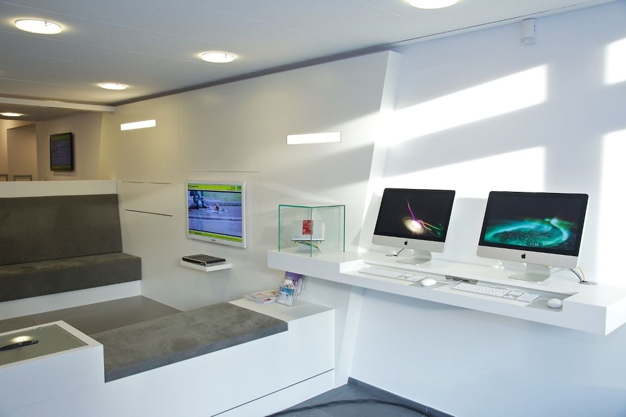 Auf einer Verkaufsfläche von 871 m2 empfängt die Post ihre Kunden in einer sogenannten „Open Service“-Umgebung mit vier offenen Schaltern, wo die ganze Palette an Postdiensten angeboten wird. Die LUXGSM-Boutique, die in diese offenen Räumlichkeiten integriert ist, bietet ein neues Konzept an: eine Produktpalette zum Anfassen. Fertig zu stellen sind bloß noch ein „Showroom“ für professionelle Kunden