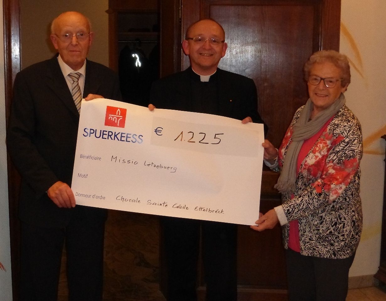 Wahrend eines Essens zur Feier der heiligen Caecilia überreichte die Chorale Ste. Cécile aus Ettelbruck einen Scheck über 1225 € an den Direktor von Missio Luxemburg, an Pfarrer Maurice Péporté. Das Geld wurde gesammelt von den Mitglieder des Chores und wird den verschiedenen Projekten der Weltmission zugeleitet.
