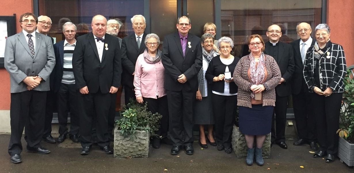 Ettelbrück - Zur Feier der Hl. Caecilia wurden folgende Mitglieder des Caecilien-Chores durch den Piusverband, vertreten durch Generalkassierer John Dusseldorf, für ihre langjährige Zugehörigkeit im Kirchenchor in Ettelbrück ausgezeichnet: mit der Goldmedaille für 30 Jahre Piusverband Herr Louis Cox und Organist Tom Schreiner. 50 Jahre kann Josette Michels-Hoffmann zurückblicken und erhielt die “Plaquette en or”. Kürzlich überreichte Erzbischof J.-Cl. Hollerich den Herren François Kieffer und Josy Majerus einen Diplom für ihre 60-jährige Mitgliedschaft im Piusverband.