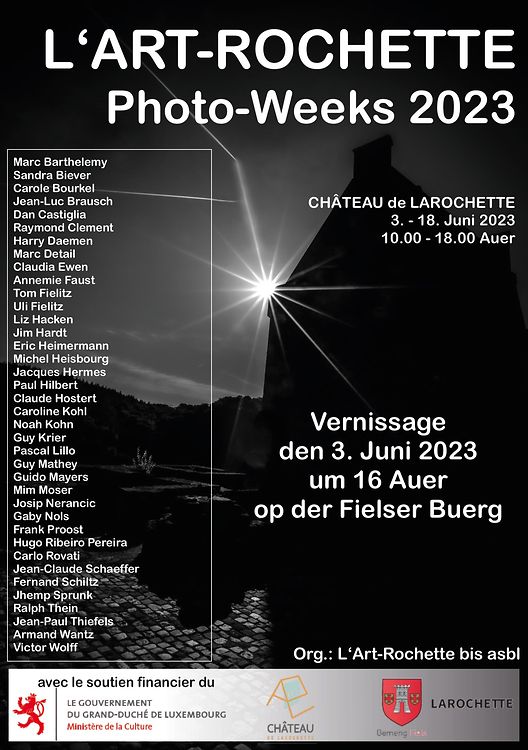Déi 3. Editioun vun den L’Art-Rochette Photoweeks fënnt dëst Joer statt vum 3-18/06/2023 op der schéiner Buerg an der Fiels. 38 Fotografen, professionneller, fédéréierter an Hobbyfotografen, stellen sech dem Thema „Lëtzebuerg“ a weisen wéi sie eist Land gesin.