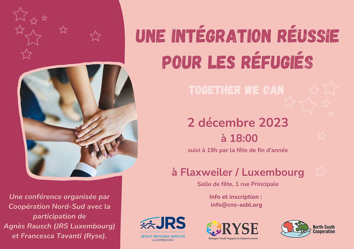 Les représentants de trois associations transmettent leur engagement pour l'intégration professionnelle des réfugiés. L'échange entre Francesca Tavanti de Ryse, Agnès Rausch de JRS Luxembourg et Roberto Marta de Coopération Nord-Sud promet d'allier expérience, dynamisme et réalisme. Le public sera captivé par l'enthousiasme de nos intervenants, qui ne manqueront certainement pas de faire des propositions concrètes pour donner un coup de main, car la réussite ne peut se faire qu'ensemble !