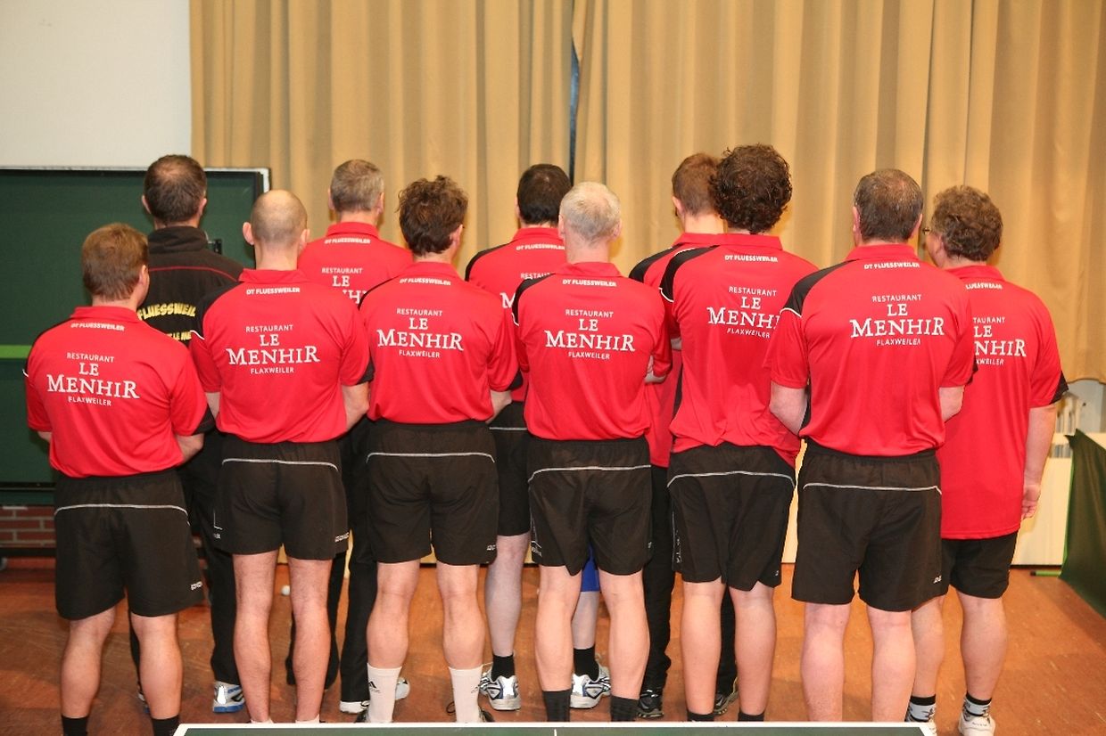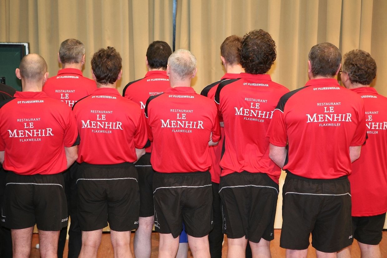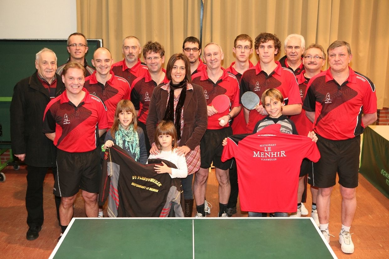 Wer Erfolg im Sport haben möchte, muss nicht nur fit, sondern auch gut gekleidet sein. Das hat sich auch das Restaurant Le Menhir aus Flaxweiler gedacht und deshalb den lokalen Tischtennisverein erneut mit passender Sportkleidung ausgestattet. Am Samstag Abend, 11. Dezember, übergab Sabrina Baiocchi der erfolgreichen Mannschaft um Präsident Ed. Steffes die neuen T-Shirts mit dem flott gestalteten Logo "Restaurant Le Menhir Flaxweiler". Ed. Steffes dankte der Dame des "Hauses aus Flaxweiler" für das grosszügige Entgegenkommen und erinnerte daran, dass Le Menhir bereits seit 2006 den Verein als Sponsor unterstützt. Mit neuer Motivation ging es sodann in die nächste Runde der Meisterschaft. Auf die erneuerte Partnerschaft wurde passend angestossen.