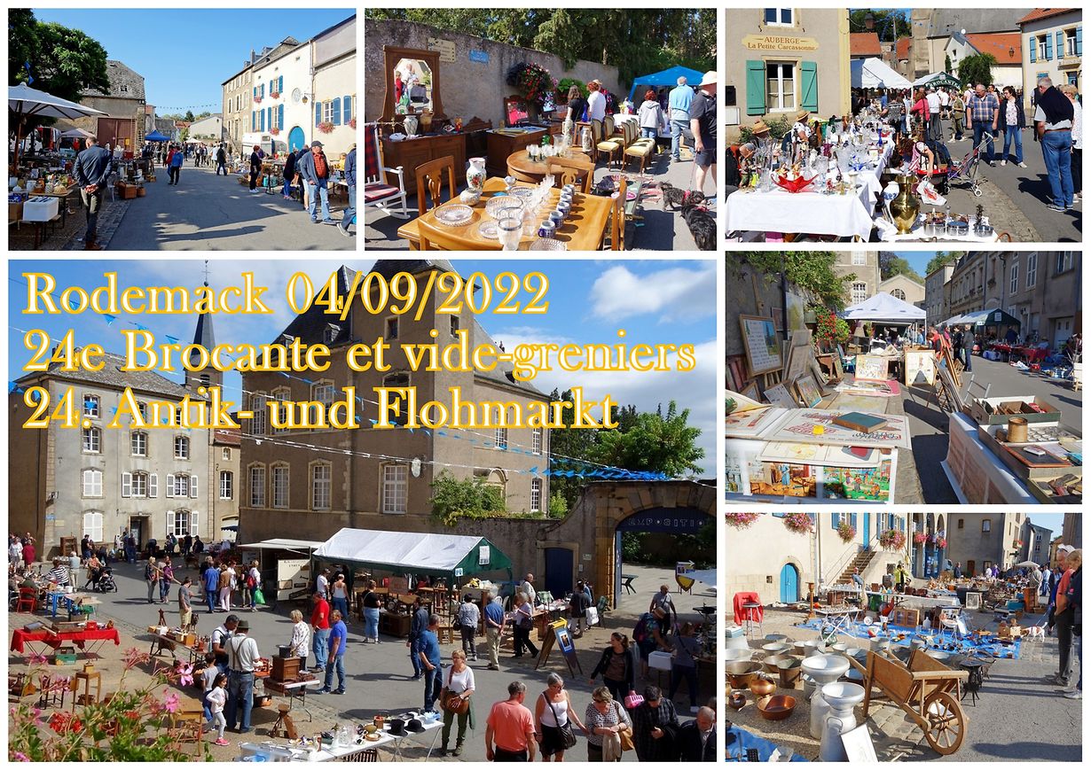 Der Verein 'Syndicat d'Initiative' organisiert zum 24. Mal einen großen Antik- und Trödelmarkt in den Straßen des historischen Dorfes RODEMACK, nahe der deutschen und luxemburgischen Grenze, das Mitglied in der Vereinigung der « Schönsten Dörfer Frankreichs » ist. Zahlreiche Aussteller aus Frankreich und den Nachbarländern bieten Möbel, Geschirr, Porzellan, Gläser, Bücher, Postkarten, Schallplatten, Münzen, Puppen, Spielzeug, Taschen, Koffer, Bilder, Haushaltswaren und vieles mehr an. Kleider, Schuhe, Neuwaren und Kopien von Antiquitäten sind nicht zugelassen.
