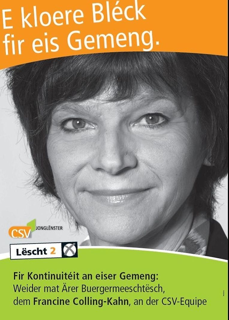 Gonderange CSV Jonglënster - Nei Affichen CSV - Junglinster 3 Picture Gallery Please scroll down,to see more pictures. Published on Wednesday, 28 September, 2011 at 00:25 Haut wor et souwäit. Mir hunn ons lescht Serie vun Affichen ugefaang opzehänken. Des Kéier stelle mir ons Buergermeeschtesch a Spëtzekandidatin Francine COLLING-KAHN an de Mëttelpunkt. Mir hoffen Iech alleguerte gefalen se och esou gutt wéi ons. Report inappropriate content More news by CSV - Junglinster > D'CSV Jonglënster seet MERCI 12/10/11 Junglinster Den neien OP DE PUNKT vun der CSV Jonglënster ass do 28/09/11 Gonderange Gemeng Lënster : Vandalismus un den CSV-Affichen 17/09/11 Junglinster D'Francine Colling-Kahn ass Spëtzekandidatin bei der CSV 28/05/11 Junglinster Jonglënster: D'CSV bestëmmt hir Kandidate fir d'Gemengewalen 18/03/11 Junglinster