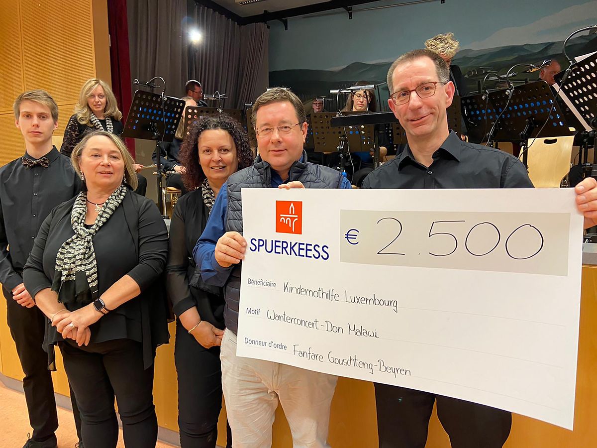 (Luxembourg, 10.02.2020) Am 14. Dezember 2019 spielten die Musiker der Fanfare Gouschteng-Beyren vor 100 begeisterten Zuschauern ihr Winterkonzert. Im Anschluss überreichte der Musikverein eine Spende von 2.500 Euro an die ONG Kindernothilfe Luxembourg.