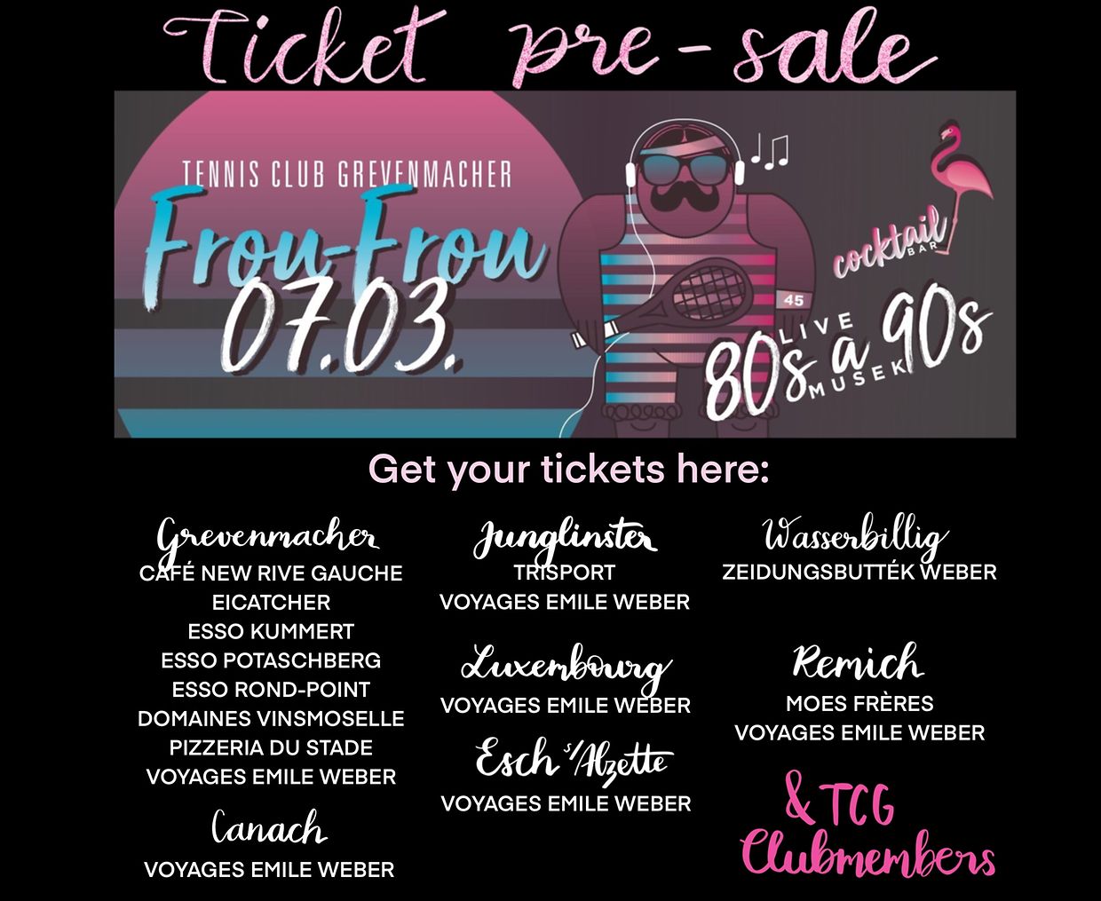 Wie jedes Jahr ist der FROU-FROU die Party am Ende der Karnevalssaison (Yep, lass dein Kostüm zu Hause)! FROU-FROU war schon immer eine Party für alle! Das Konzept der letzten Jahre ist super bei unseren Gästen angekommen, so haben wir auch in diesem Jahr die Live Cover Band WALLSTREET engagiert, die Songs aus den 80er und 90er Jahren aufführen wird. WALLSTREET wird in der Kellerei auftreten. Draußen (also nicht wirklich draußen, es ist ein riesiges beheiztes Zelt), bleibt das Pogramm das gleiche: never change a winning Team! Deshalb wird das DJ Set EAST COAST DEVILS Musik auflegen und für Party Stimmung sorgen. Hier wird sicher die ganze Nacht durchgetanzt! Kommt schon um 21 Uhr in die Kellerei, das DJ SET GIBBES CREW legt zum Warm-up auf! Und wenn du auf der Suche nach speziellen Getränken bist, komm an die Cocktailbar im inneren der Kellerei. ++ Gratis Bus Service++ -> Buspläne auf latenightbus.lu & frou-frou.lu