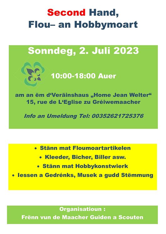 D´Amicale „Frёnn vun de Maacher Guiden a Scouten“ organiséiert och dëst Joer erëm hire Second Hand, Flou- an Hobbymoart am Veräinshaus „Home Jean Welter“ an an der Rue de l´Eglise zu Maacher.