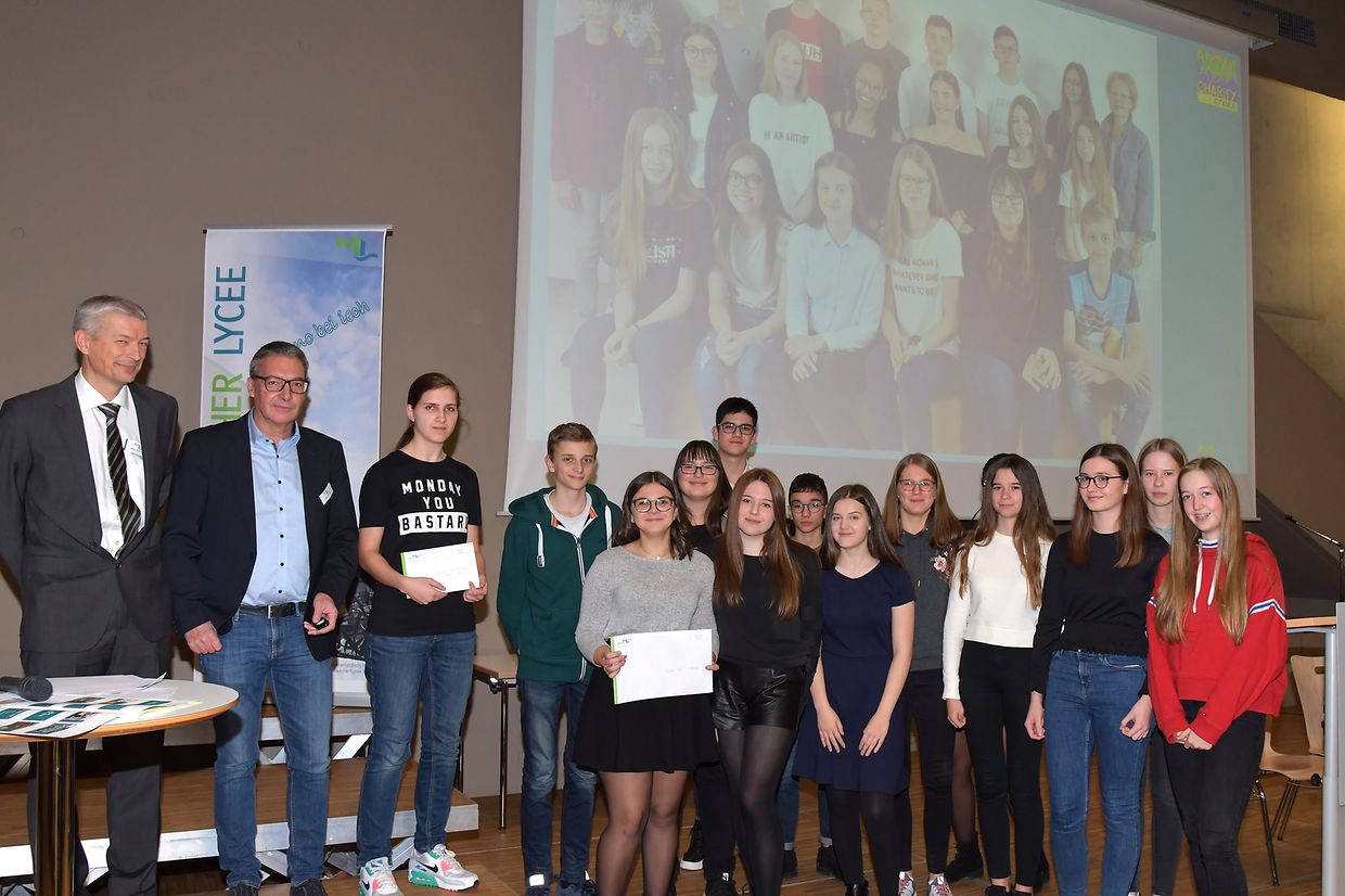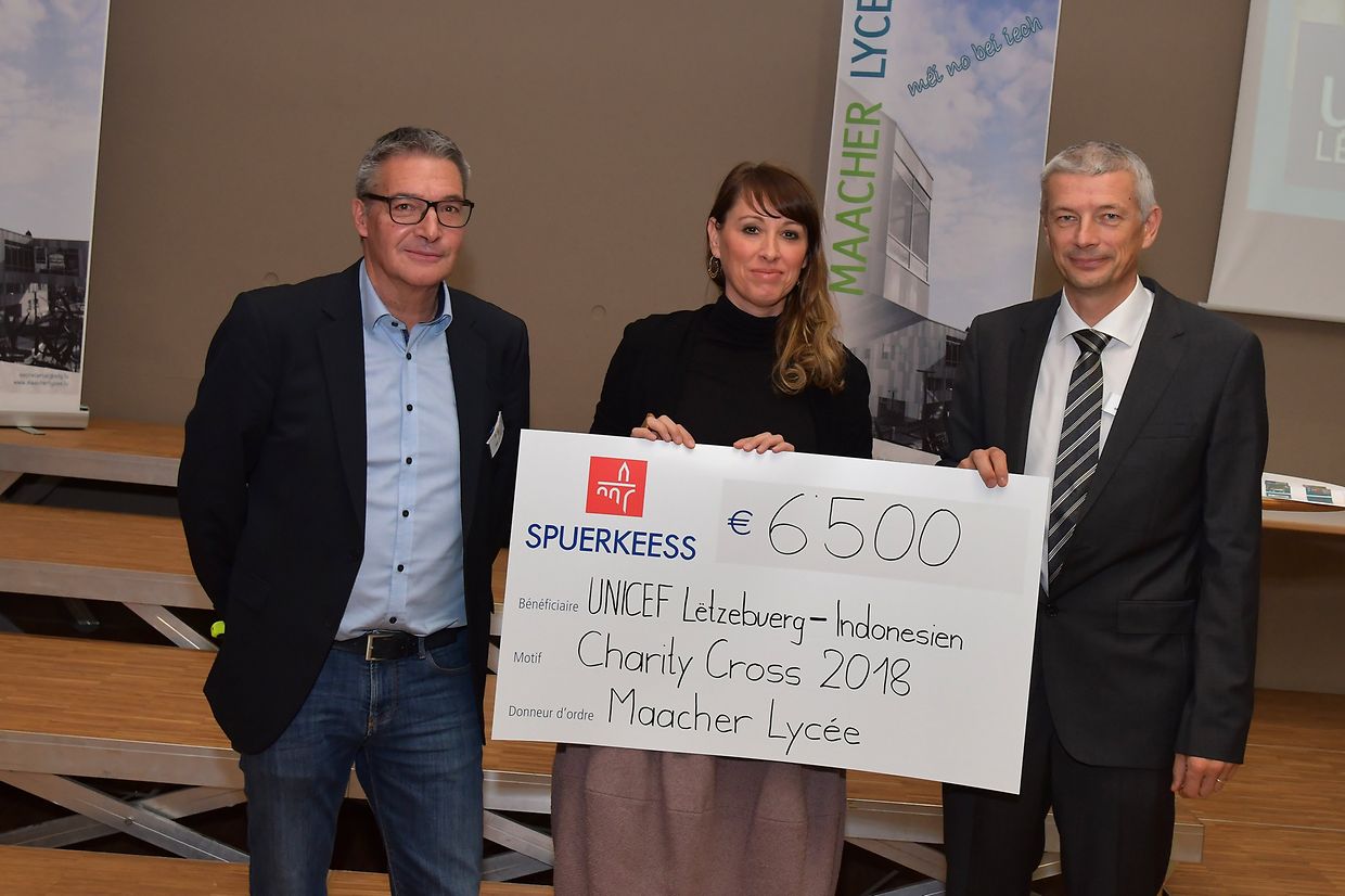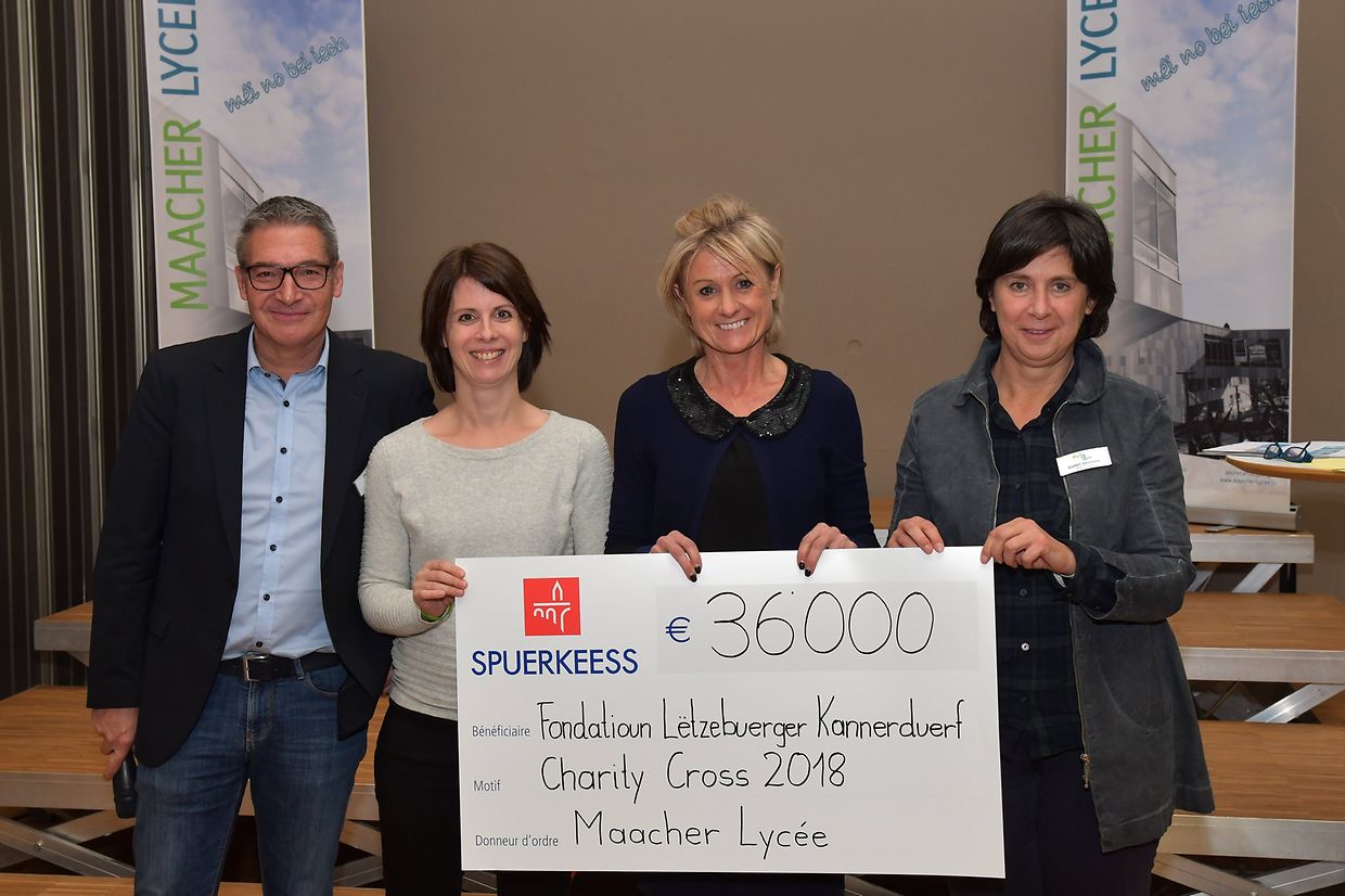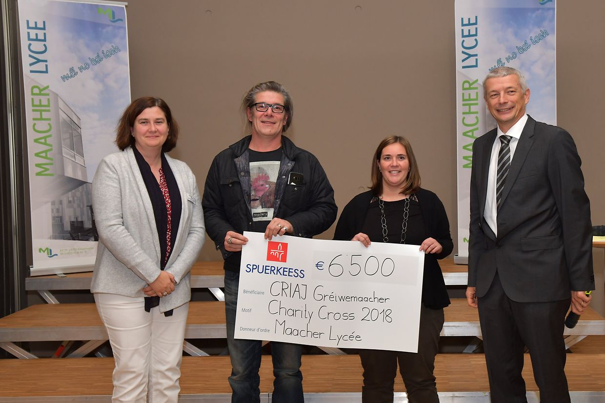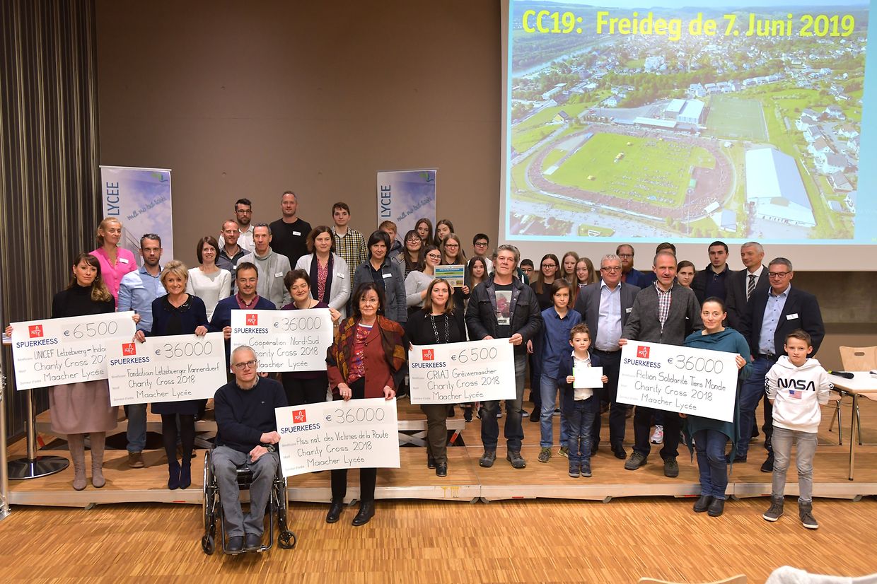 Im Rahmen der feierlichen Schecküberreichung am Donnerstag, den 22. November 2018, im Festsaal des Maacher Lycée wurde dann den Vertretern der 4 Hauptvereinigungen ein Scheck in Höhe von jeweils 36.000 € überreicht. Das CRIAJ Grevenmacher und UNICEF Lëtzebuerg ihrerseits wurden mit einer Unterstützung von jeweils 6.500 € bedacht. Zusätzlich erhielten aber auch die 3 Organisationen, die nicht als direkte Begünstigte des Charity Cross 2018 zurückbehalten worden waren, einen Solidaritätsbeitrag von jeweils 250 Euro.