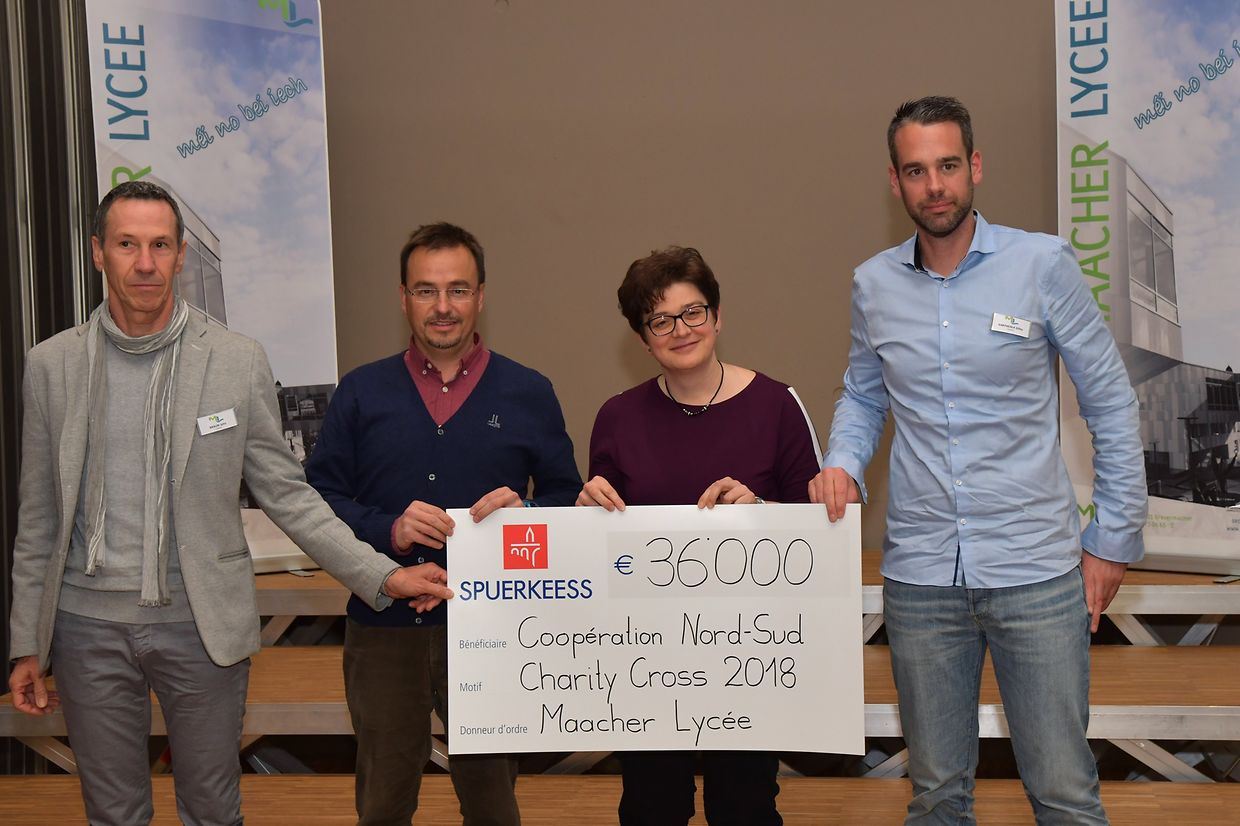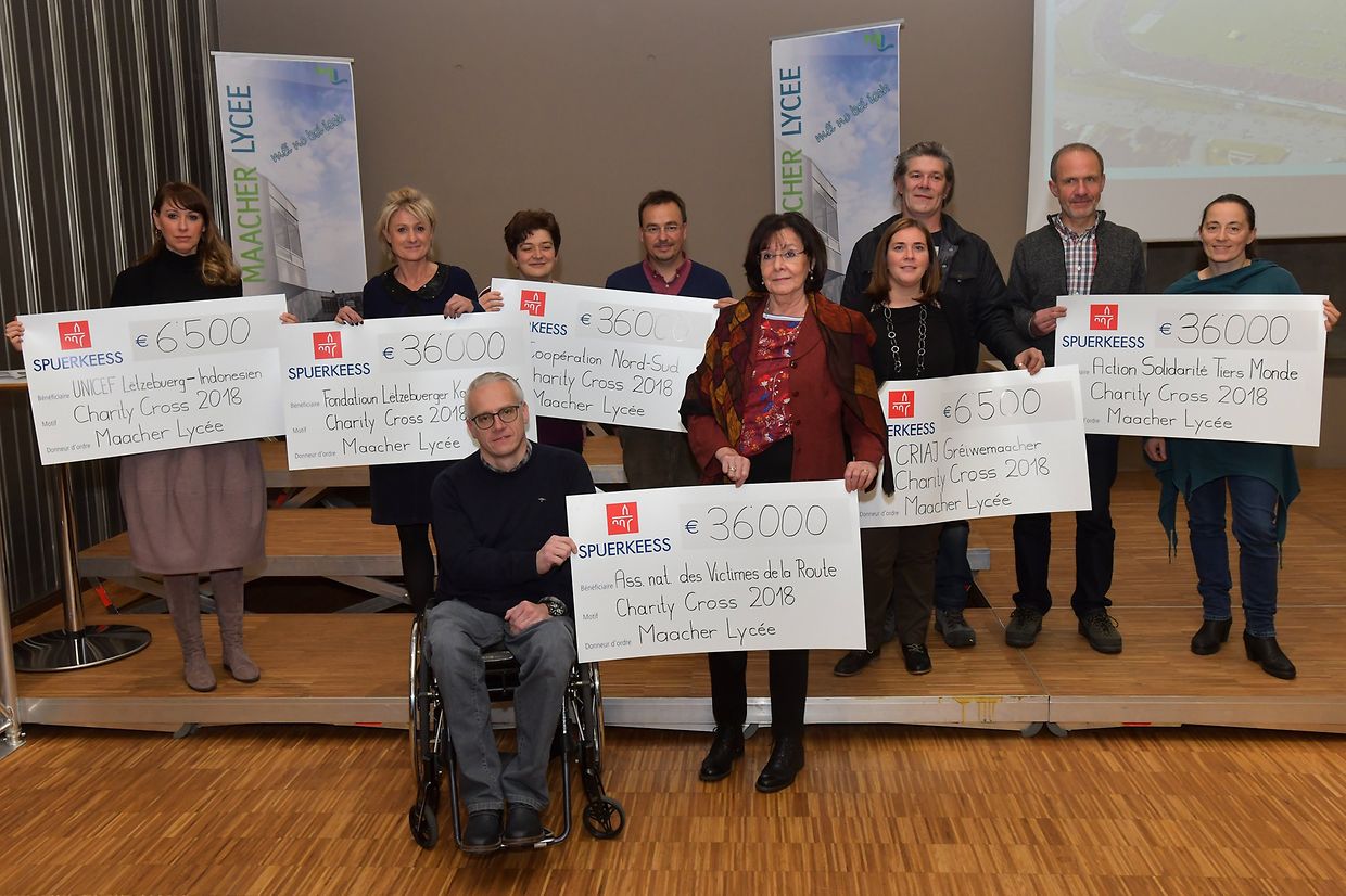 Die Gesamtsumme der 18. Ausgabe des Charity Cross wird zu gleichen Teilen an vier wohltätige Organisationen mit Sitz in Luxemburg verteilt werden. Im Dezember 2017 beschlossen nämlich die LehrerInnen der Grundschulen sowie die Schüler und Lehrer des Maacher Lycée, zusammen mit dem Organisationskomitee des Charity Cross, dieses Jahr die Vereinigungen „Fondation Lëtzebuerger Kannerduerf“, „Association nationale des Victimes de la Route“, „Coopération Nord-Sud a.s.b.l.“ sowie die „Action Solidarité Tiers Monde“ finanziell zu unterstützen. Als zusätzliche Begünstigte wurden dieses Jahr aber auch das „CRIAJ Grevenmacher“ und „UNICEF Lëtzebuerg“ zurückbehalten.