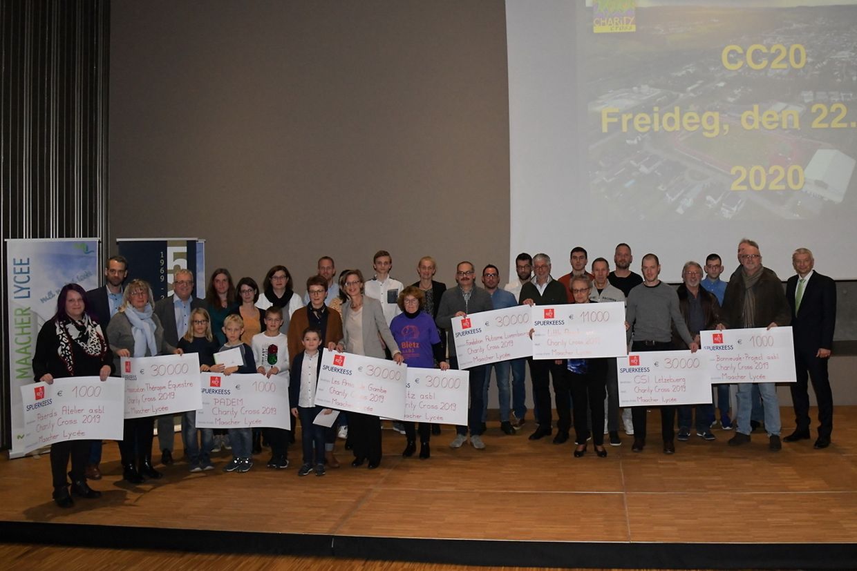 Im Rahmen der feierlichen Schecküberreichung am Donnerstag, den 28. November 2019, im Festsaal des Maacher Lycée wurde dann den Vertretern der fünf Hauptvereinigungen ein Scheck in Höhe von jeweils 30.000 € überreicht. Die „Little Angels a.s.b.l. ihrerseits wurde mit einer Unterstützung von 11.000 € bedacht. Zusätzlich erhielten aber auch die 4 Organisationen, die nicht als direkte Begünstigte des Charity Cross 2019 zurückbehalten worden waren, einen Solidaritätsbeitrag von jeweils 1.000 Euro.