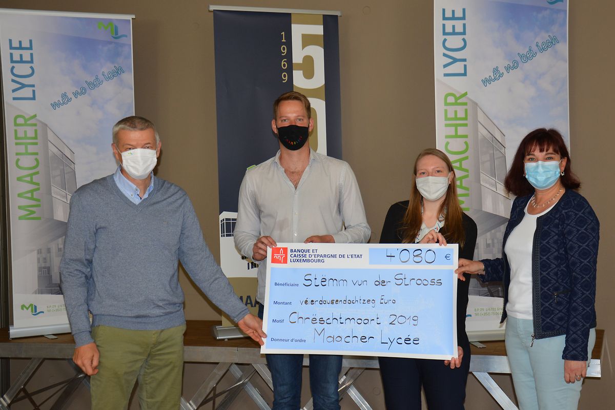 Die Wohltätigkeitsvereinigung (ALYGRE) des Maacher Lycée trägt zu den neuen Projekten der Stëmm vun der Strooss bei. Vertreten durch Herrn Yves Mentgen, stellvertretender Direktor des MLG und Frau Chantal Eicher, Professorin am MLG und Präsidentin der ALYGRE, überreichte die gemeinnützige Vereinigung am Montag, den 17. Mai 2021, einen Scheck über 4.080 € an Herrn Bob Ritz, Kommunikationsbeauftragter der Stëmm vun der Strooss. Eine Gruppe von Schülern nahm an der Schecküberreichung teil und verfolgte aufmerksam eine Präsentation der Aktivitäten der Stëmm.