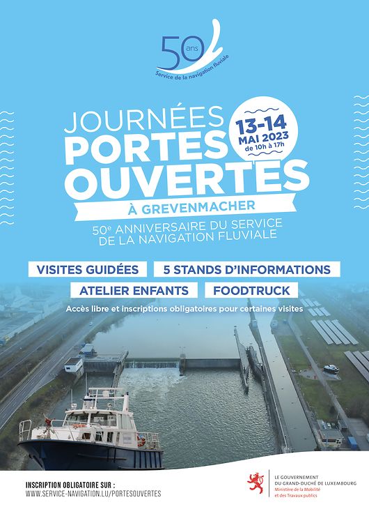 Le Service de la navigation fluviale a le plaisir de vous inviter aux journées portes ouvertes à l’occasion de son 50e anniversaire, les 13 et 14 mai 2023, au barrage-écluse de Grevenmacher.