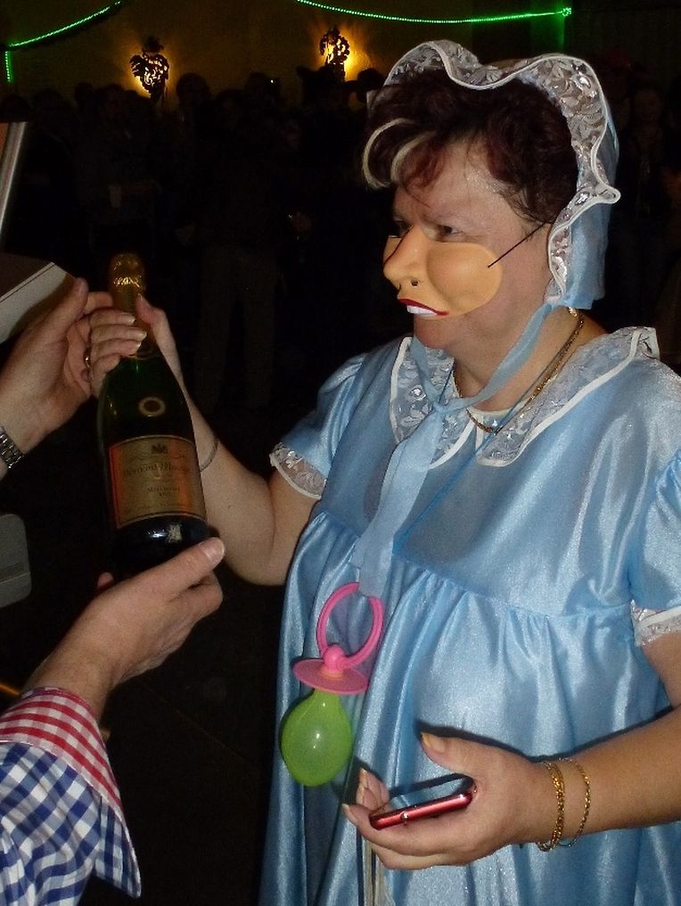 Die 3 Trostpreise in Form der traditionellen Flasche „Schampes“ gingen dieses Jahr an eine Gruppe fleissiger Bienchen, an eine im Rokokostil gekleidete Dame und an ein Baby mit zahnreichem Dauergrinsen und antikem Puppenwägelchen.