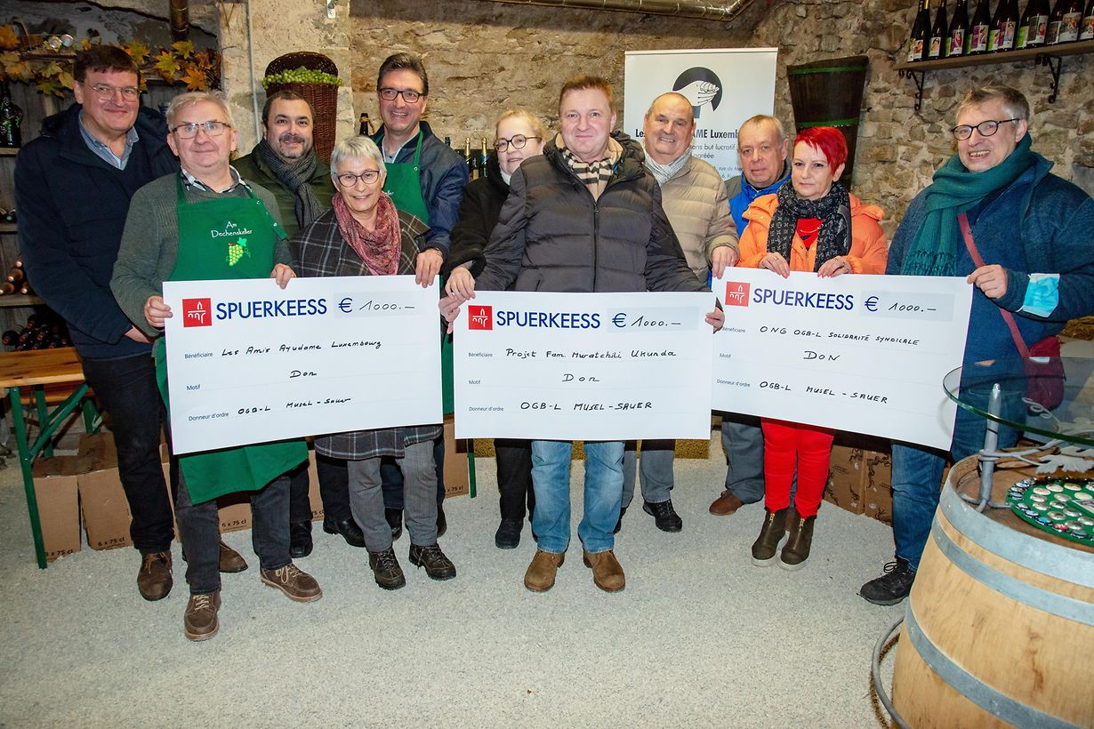 Dëser Deeg am Dechentkeller zou Gréiwemaacher huet d'Sektioun OGB-L Musel-Sauer Solidaritéit gewisen an dräi Schecker iwwerrecht un: ONG OGB-L Solidarité Syndicale a.s.b.l. , Les Amis Ayudame Luxembourg a.s.b.l. , Projet Famill Mwatchili (Ukunda Kenia)