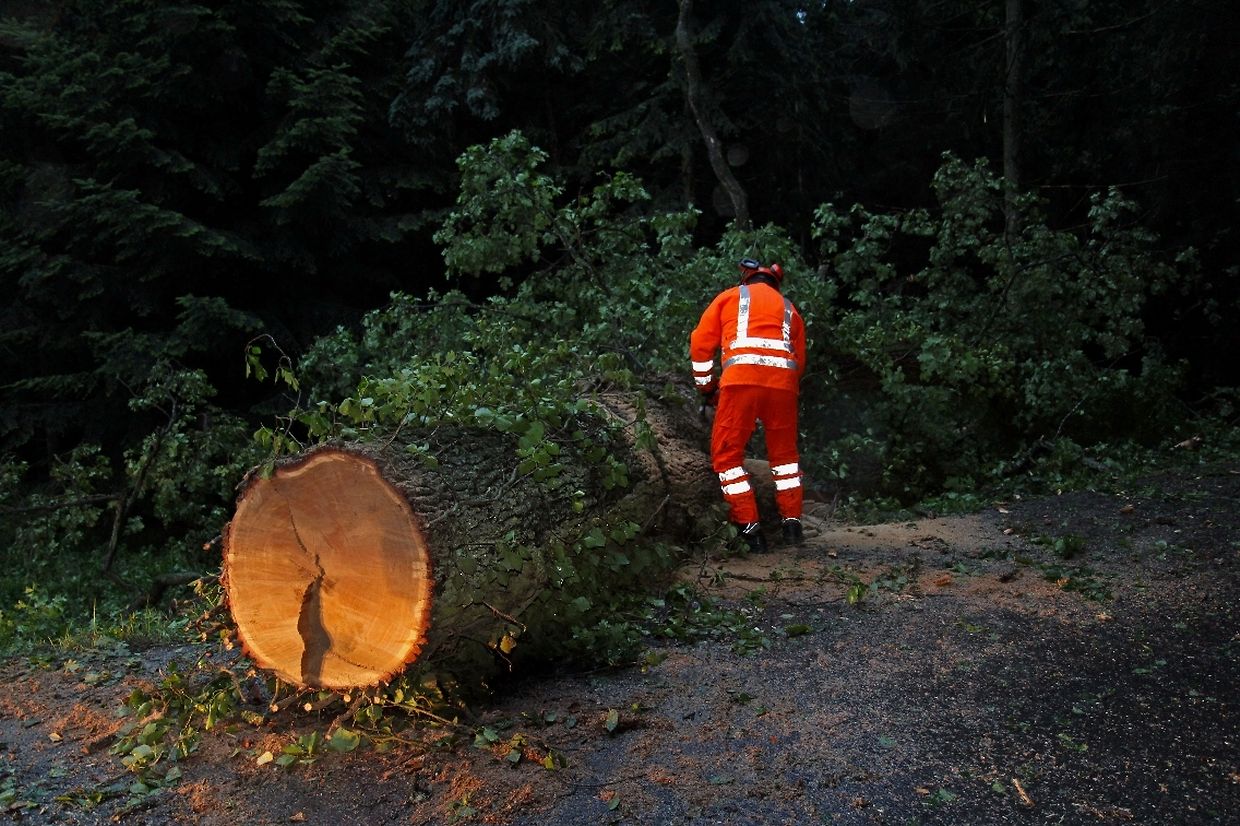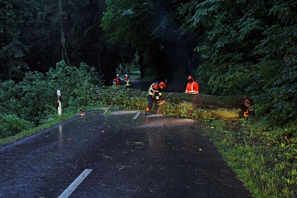 Gegen 20.45 Uhr fiel auf der Strecke zwischen Mertert und Manternach ein dicker Baum mit einem Durchmesser von über einem Meter auf die Fahrbahn und blockierte diese gänzlich. Über anderthalb Stunden wurde benötigt, um dem Baum mittels drei Motorkettensägen, einer Seilwinde und einem Kran von der Fahrbahn zu beseitigen.