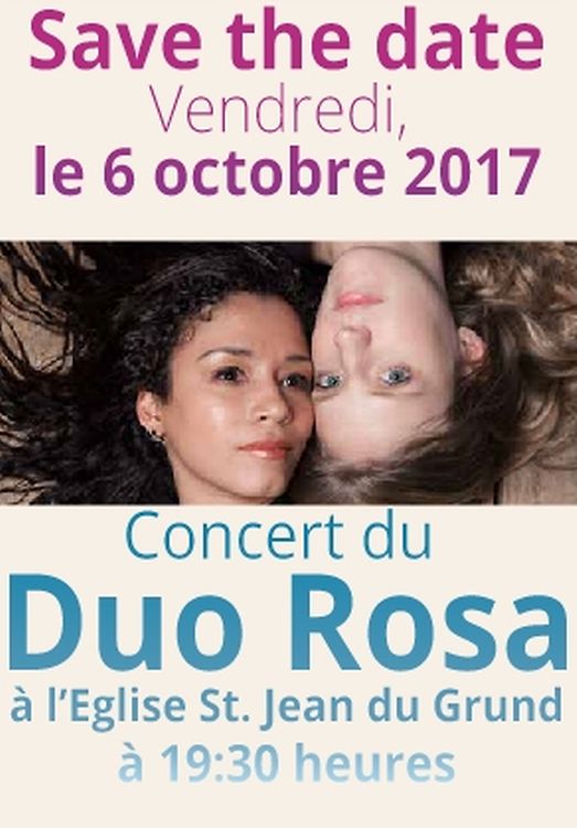 Concert Duo Rosa à 19.30 heures à l'Eglise Saint Jean du Geund. Les réservations des places pour ce concert se font par un virement de 22 Euros sur le compte de Dignity Asbl. www.dignity.lu