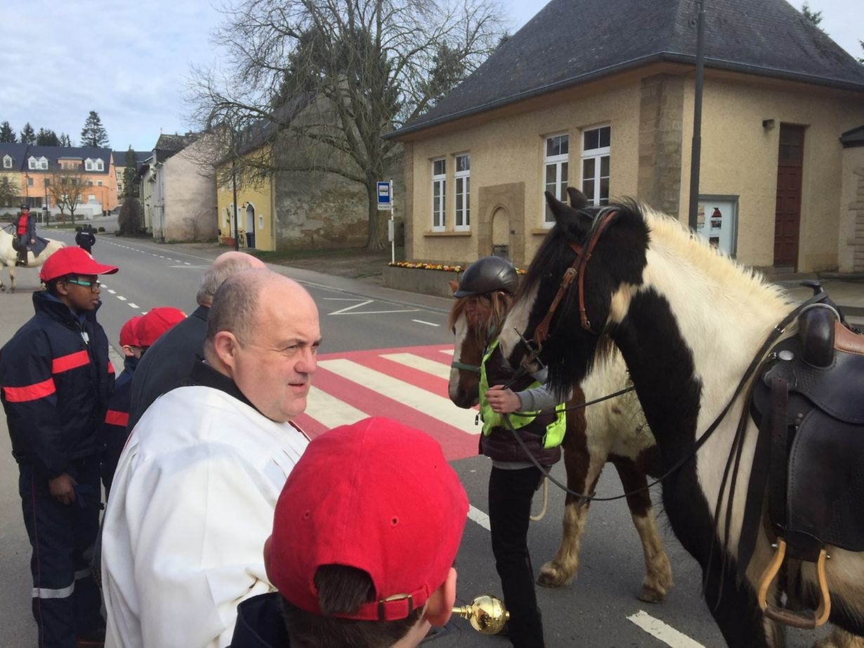 Etwa 80 Fahrzeuge fuhren in diesem Jahr im Korso an Diakon Léon Weber vorbei, der die Pferde, Fahrzeuge sowie Feuerwehrfahrzeuge der Gemeinde und die Fahrer segnete, auf dass sie unfallfrei ihren Weg fortsetzen mögen. Wie in den Jahren zuvor verteilten die Mitglieder der CIW-Jugendfeuerwehr aus Weiler-la-Tour, zusammen mit ihrem Kommandanten Daniel Kolber, Ostereier, an alle Anwesenden. Die Verkehrssicherheit wurde von der Polizei Roeser gewährleistet.