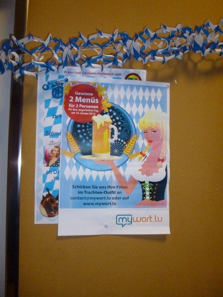 Dat wor gëscht Owend zu Hiefenech am Centre Culturel ugesot. De Kapitän Ända an de Matrous K1000, d'Sandy an de Rol an de Woddy hu fir super Stëmmung gesuergt, Danzpiste wor de ganzen Owend gutt gefëllt. Niewent dem normale Wäissbéier gouf et och een fir de Chauffeur vum Owend an d'Wäisswurscht oder de Leberkäs konnt een sech derbäi gutt schmaache loossen. Vill Leit woren esouguer an der richteger Truecht op Hiefenech komm fir ze feieren, wei der Iech op de Biller kennt iwwerzeegen. Denkt och drun aer schéinste Biller an der Truecht op mywort.lu eropzelueden, well et kann een 2x2 Menüen fir den Ungareschen Dag den 13. Januar 2013, organiséiert vun de"Frënn vun Csókakö", gewannen.